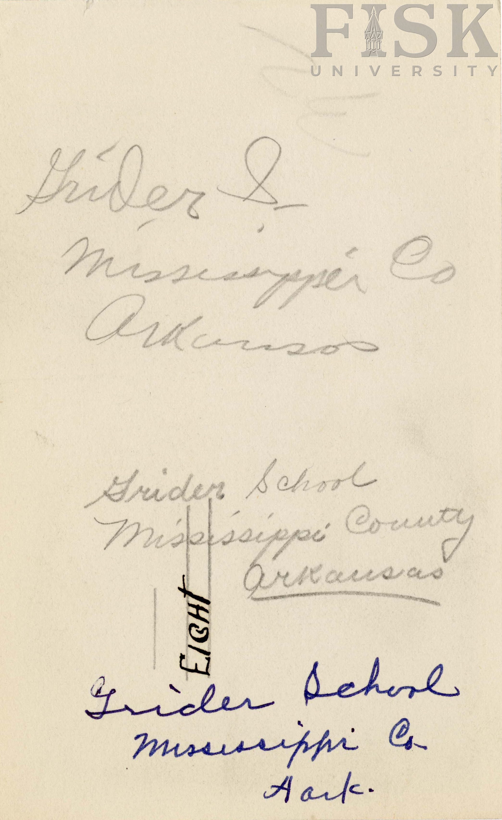 - Photo shows the front view of Grider school in Mississippi, Arkansas with a note that says, "Grider School, Mississippi Co. Arkansas"