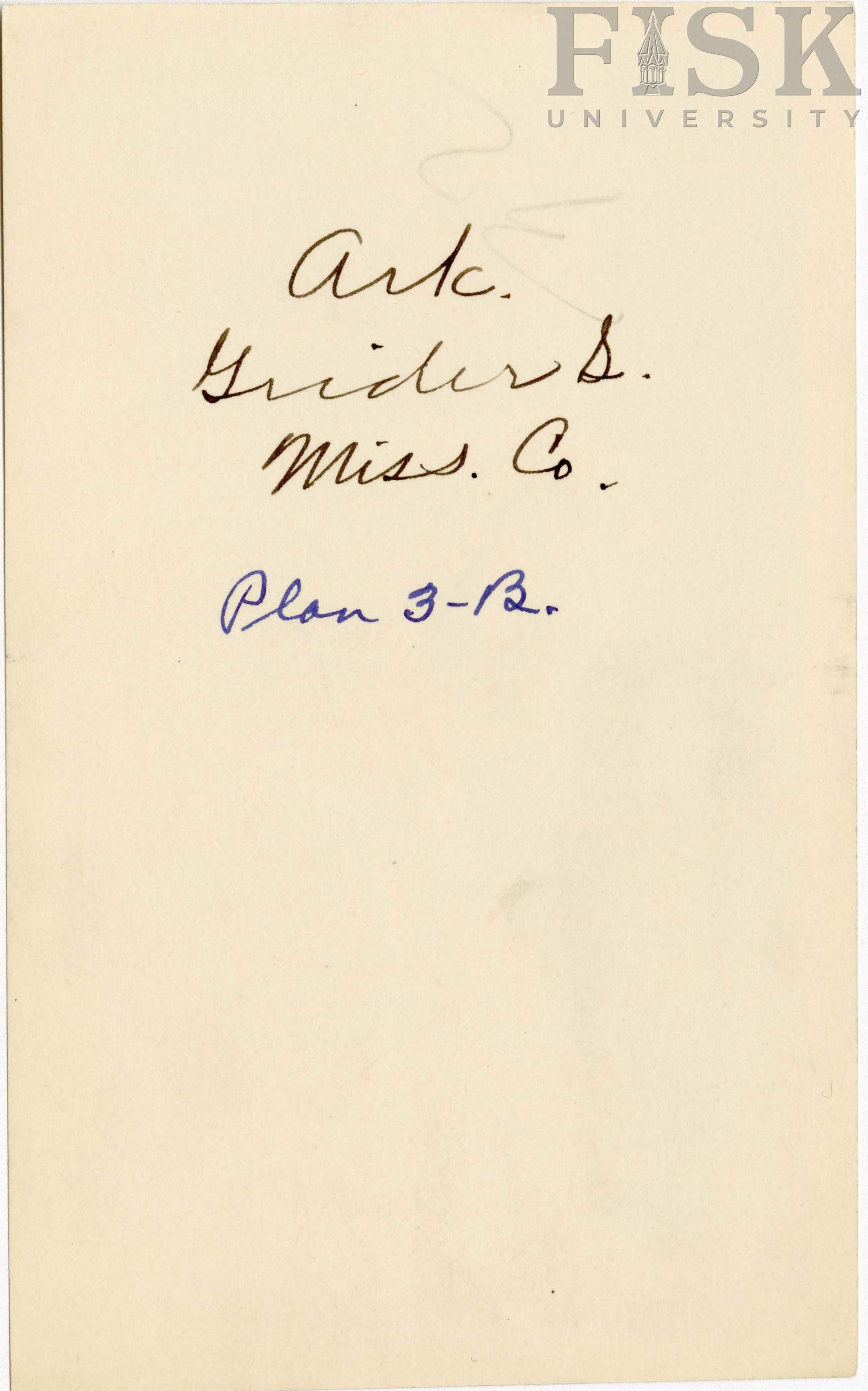 - Photo shows visitors outside of Grider school in Mississippi, Arkansas with a note that says, " Ark. Grider S. Miss. Co. Plan 3-B"