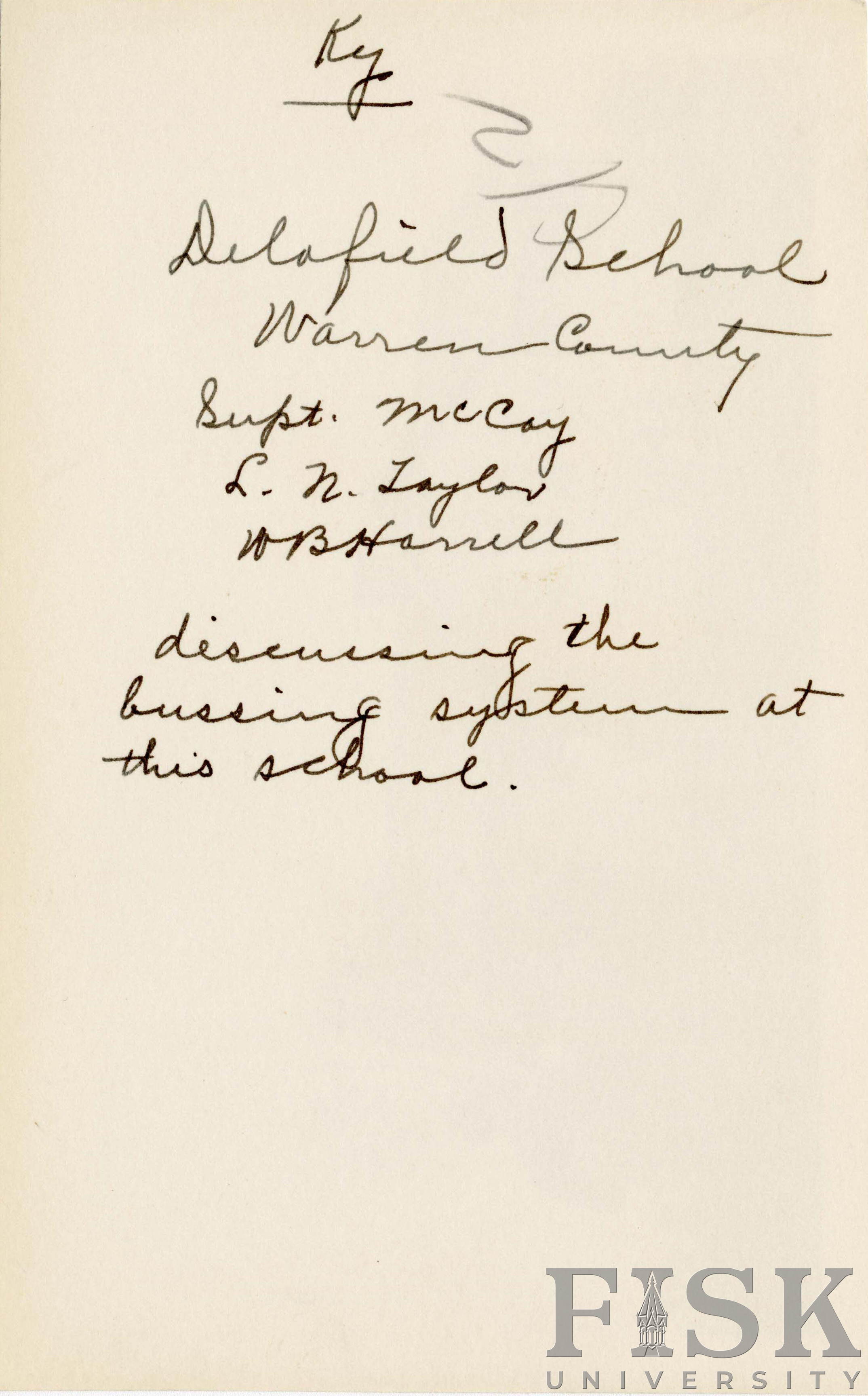 - Front and back photo of Delafield school with a handwritten note on the back that says "Supt. McCoy L. N. Taylor WB Harnell" and "discussing the bussing system at this school."