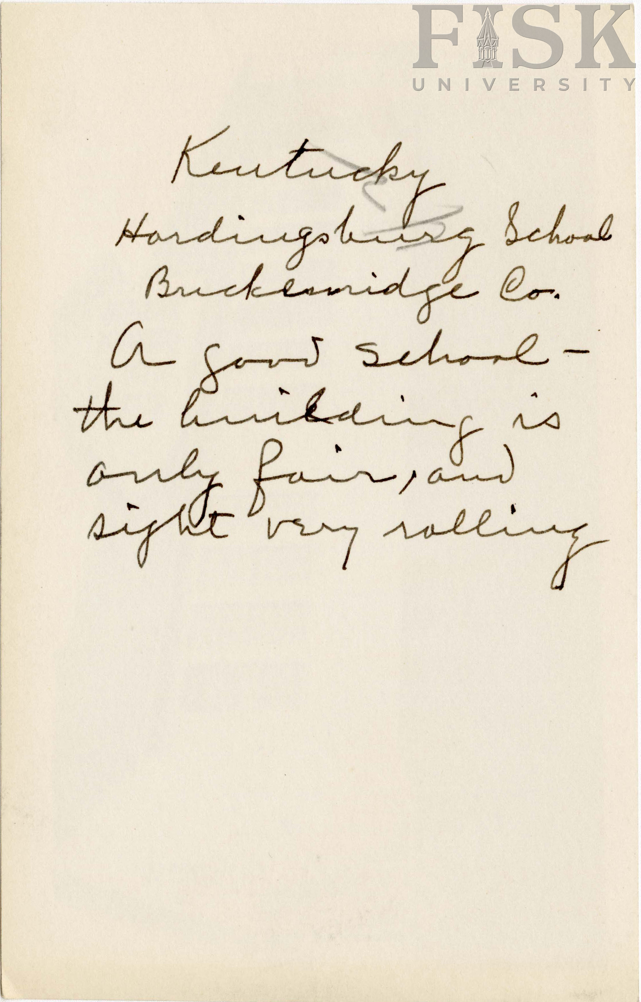 - Front and back photo of the rear of Hardinsburg school with a handwritten note on the back that says "A good school--the building is only fair, and sight very rolling"