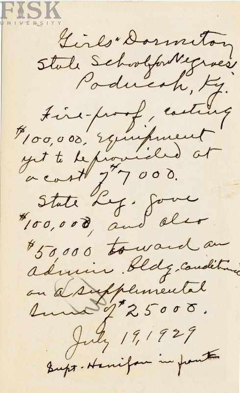 - Front and back photo of the Girls' Dormitory at the State School for Negroes in Paducah County, Kentucky. A note on the back of the photo reads, "fire-proof, costing $100,000, equipment yet to be provided at a cost of $7,000. State Leg.gave $100,000 and also $50,000 toward an admin. bldg. conditioned on a supplemental sum of $25000. July 19, 1929. Supt. Hanifon in front."