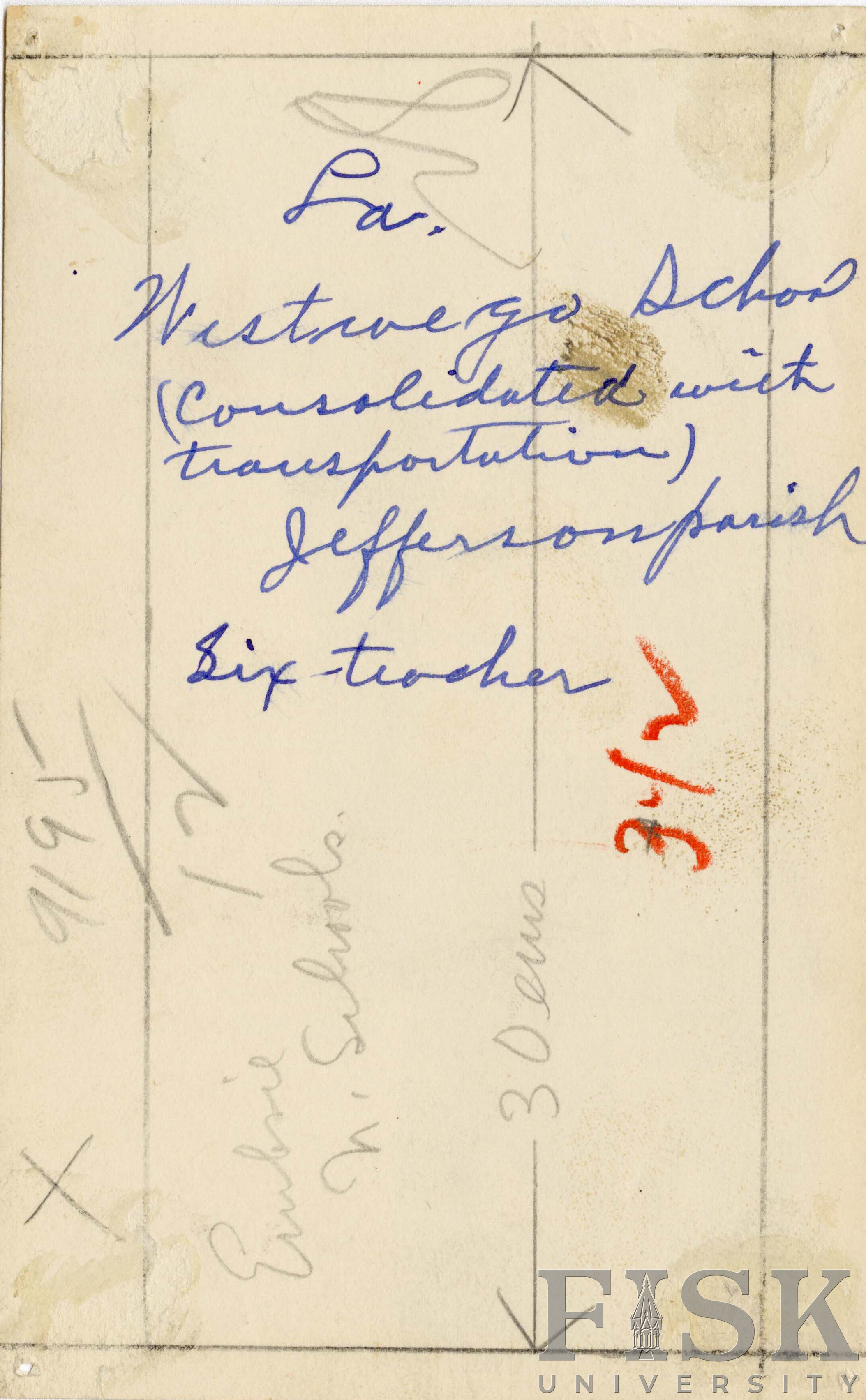 - Photo shows Westwego school in Jefferson Parish, Louisiana with a handwritten note on the back that says, "(Consolidated with transportation) Six-teacher"
