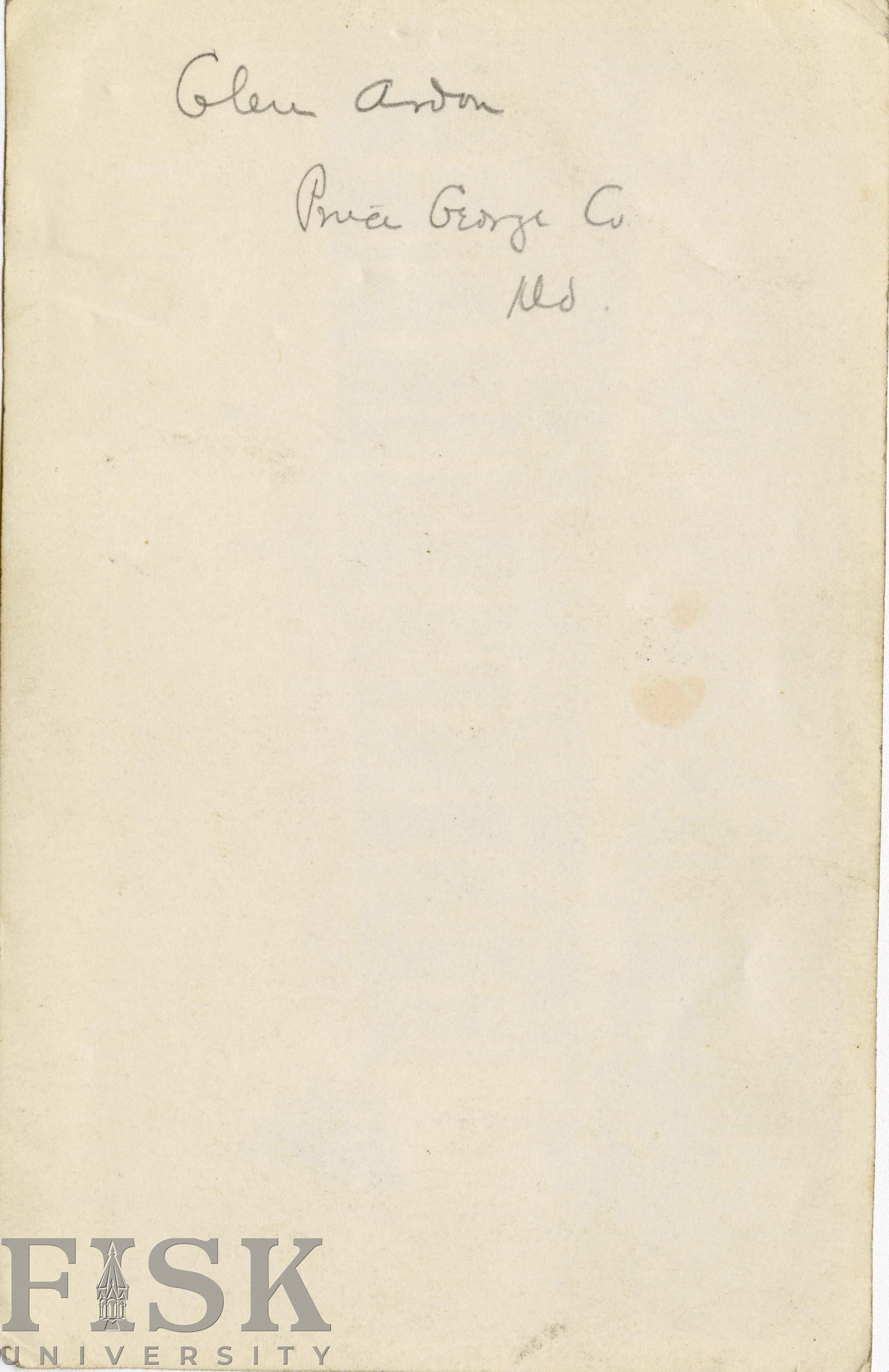 Photo shows the anterior view of Glen Arden school in Prince George, Maryland and a handwritten note on the back that says "Glen Arden, Prince George Co. MD"