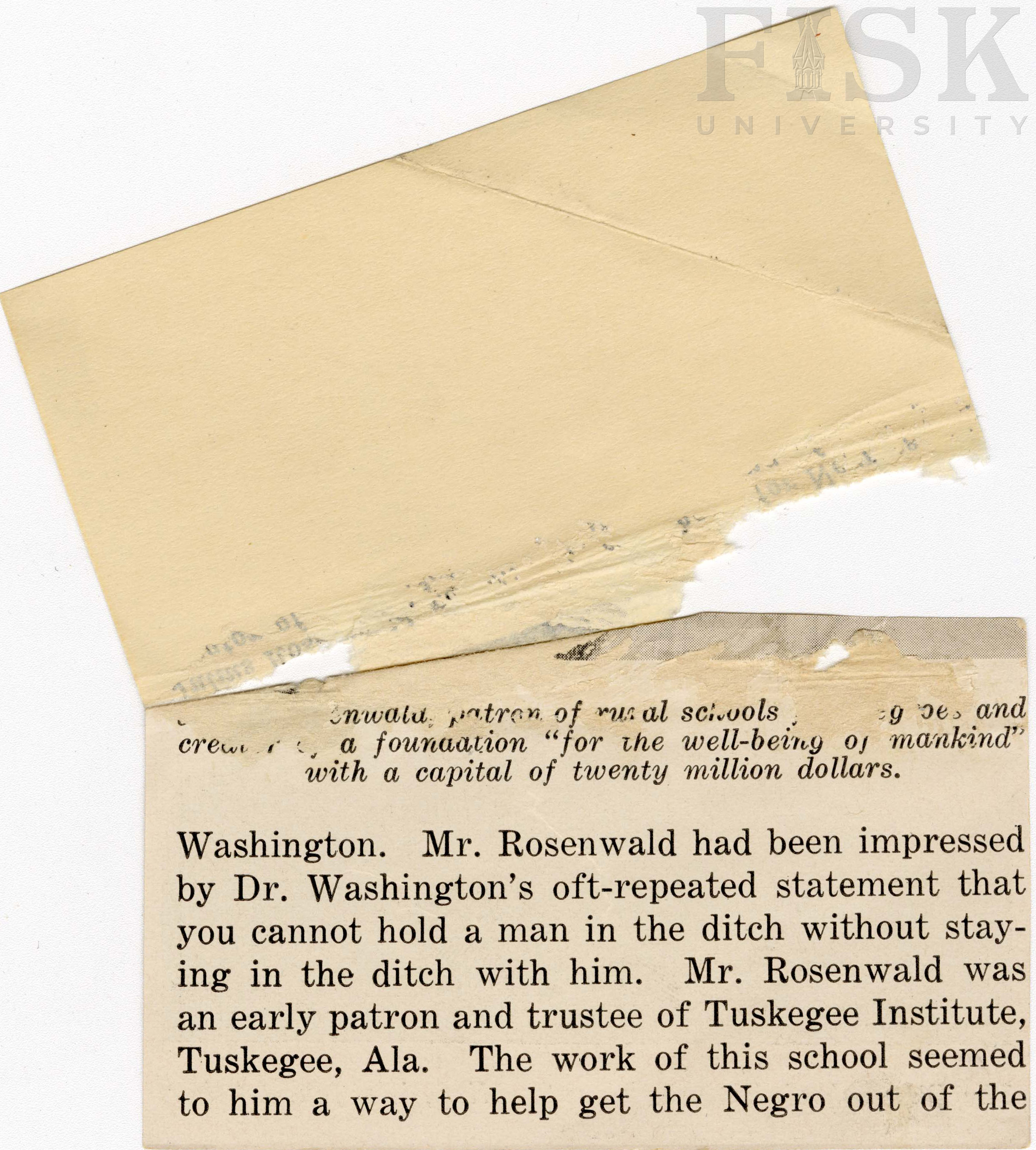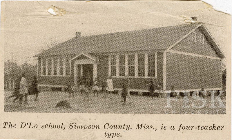 - Newspaper photo shows students outside along with a description of the D'Lo School in Simpson County, Mississippi. Attached to the back is a newspaper clipping described Julius Rosenwald's positive impression of Booker T. Washington and Tuskegee Institute.