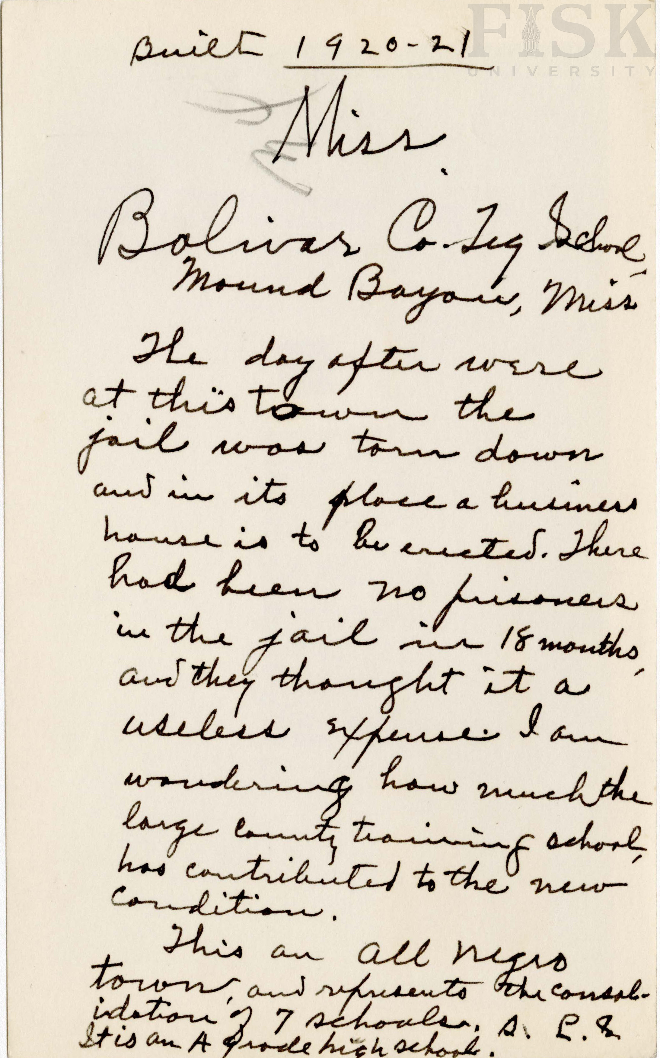 - Photo shows the front view of Bolivar County Industrial County school and a handwritten note on the back that says "Built 1920-21." and "The day after we're at this town, the jail was torn down and in its place a business house is to be erected. There had been no prisoners in the jail in 18 months, and they thought it was a useless expense. I am wondering how much the large county taining school has contributed to the new condition. This an all negro town and represents the consolidation of 7 schools. It is an A grade high school. S.L.S."