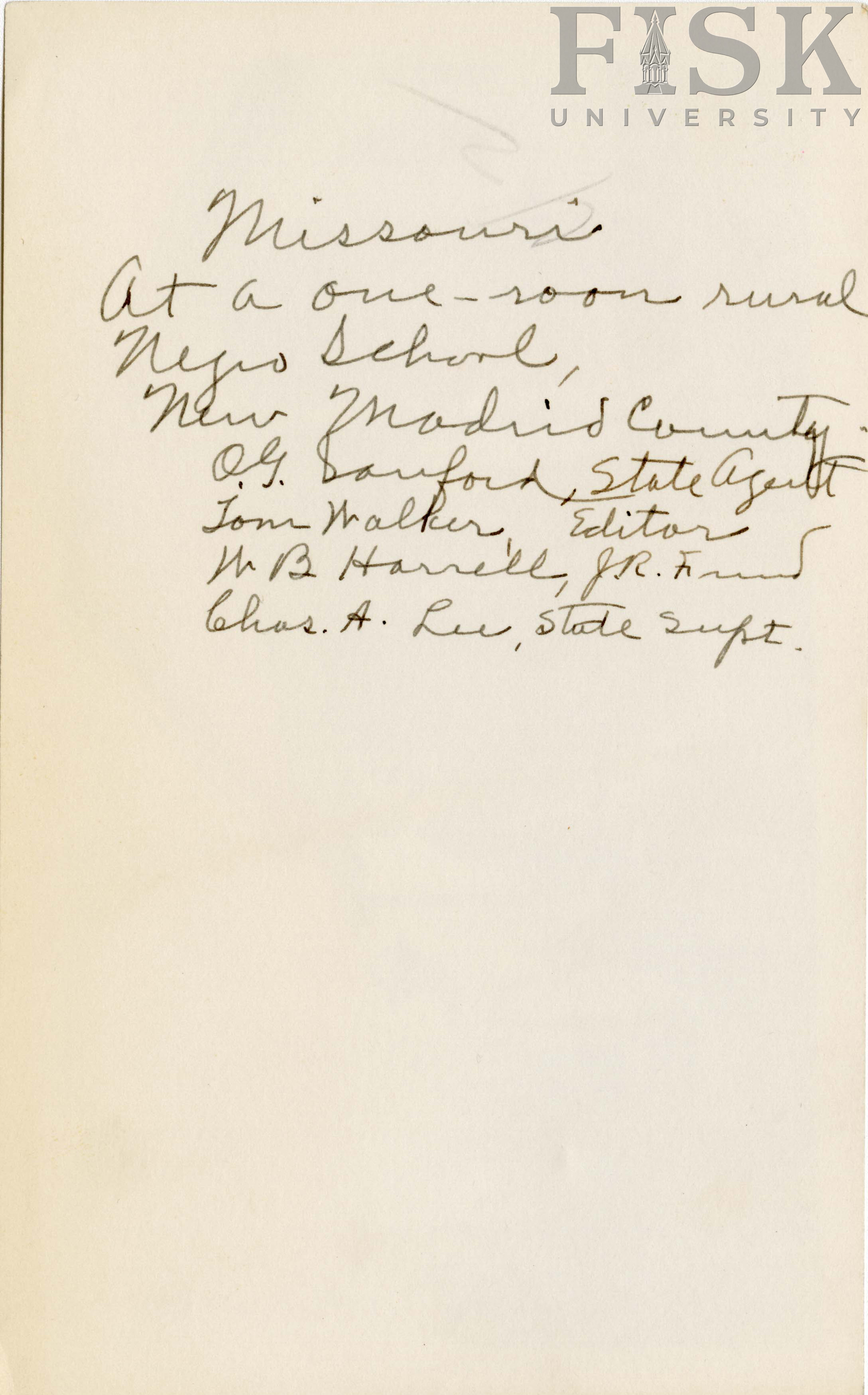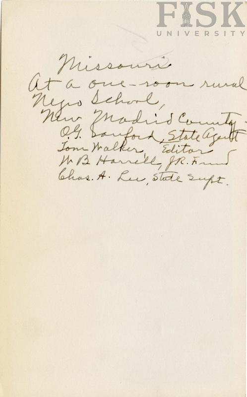 - Photo shows school visitors in front of an unidentified school in New Madrid, Missouri with a handwritten note on the back that says "At a one-room rural negro school, New Madrid county. O.G. Sanford, State Agent; Tom Walker, Editor; W.B. Harrell, JR Fund; Chas. A. Lee, State Supt."