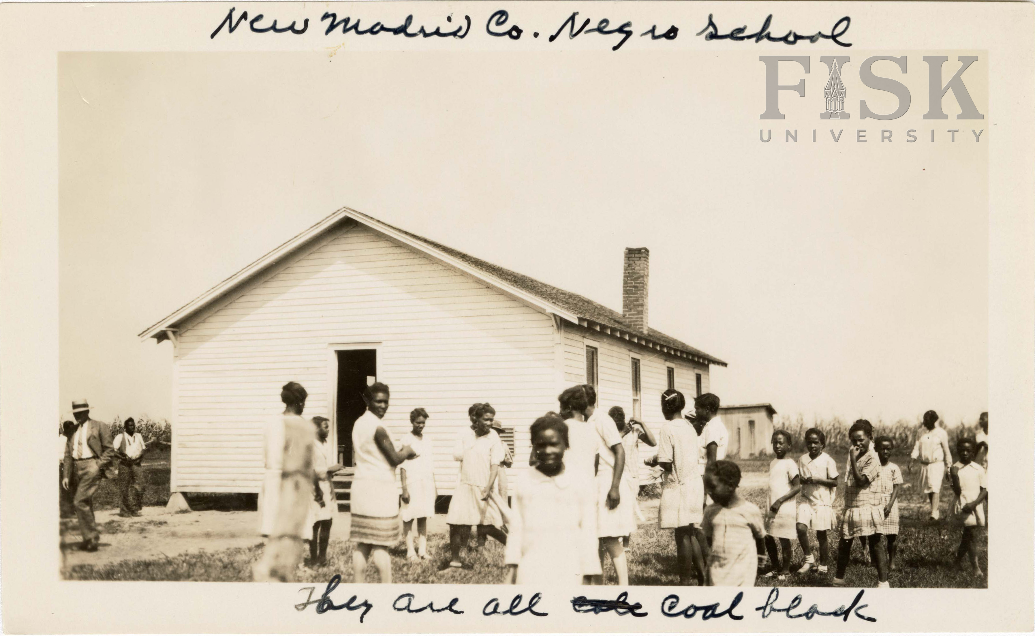 - Photo shows students and others outside of New Madrid County Negro school in New Madrid, Missouri with a handwritten note on the back that says "New Madrid Co. Negro school" and "They are all coal black"