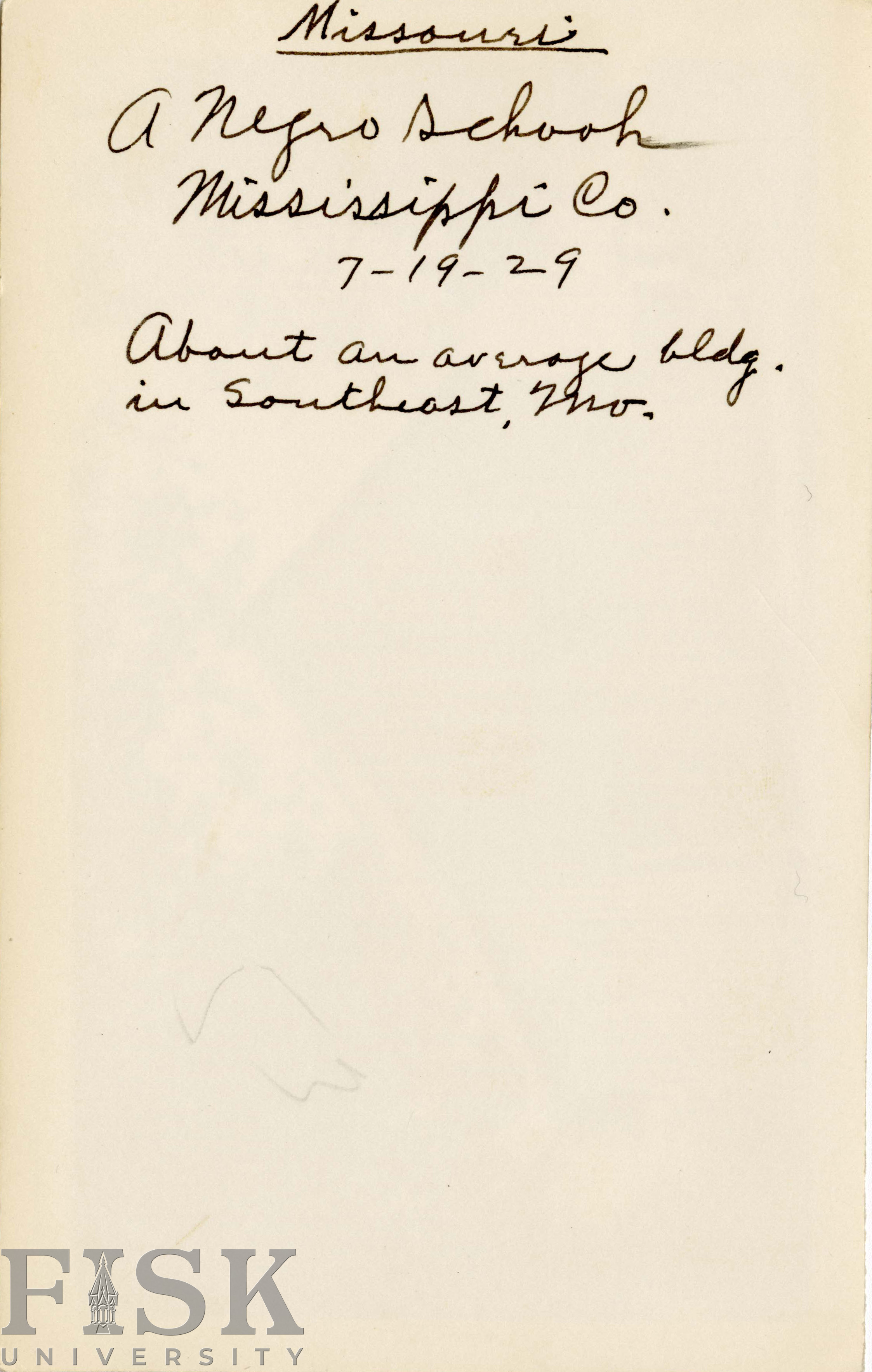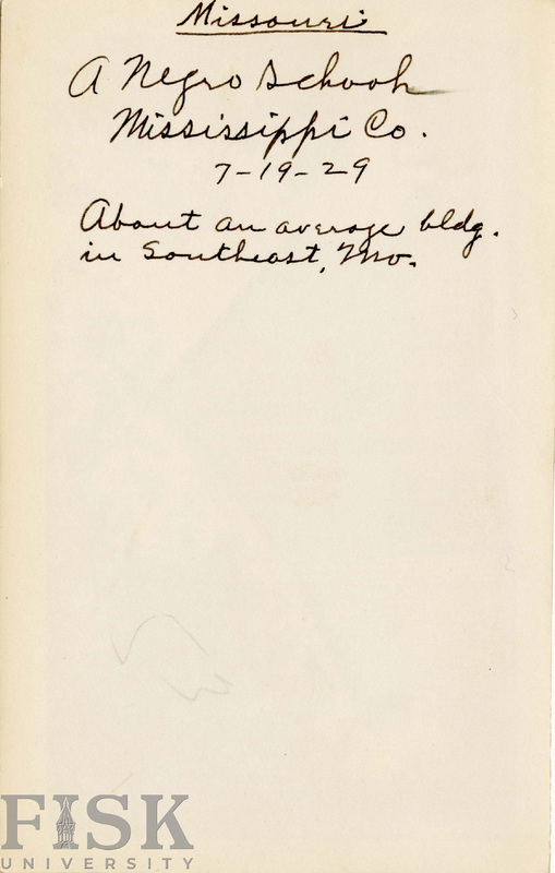 - Photo shows the front view of an unidentified school in Mississippi, Missouri with a handwritten note on the back that says "Missouri. A Negro School, Mississippi Co., 7-19-29. About an average building in southeast, MO."