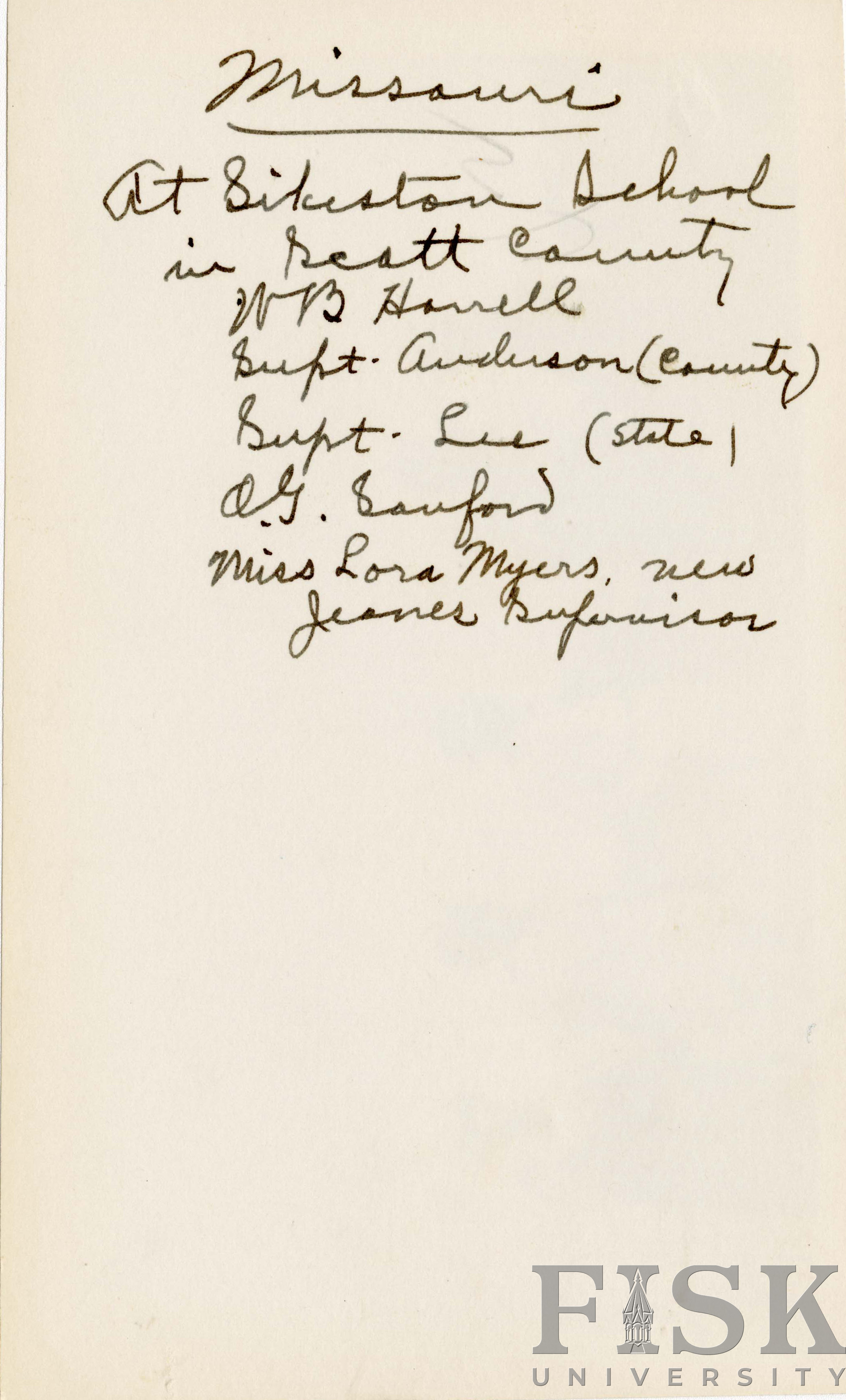 - Photo shows community visitors at Sikeston in Scott, Missouri with a handwritten note on the back that says "Missouri. At Sikeston School in Scott county. WB Harrell; Supt. Anderson (county); Supt Lee (state); O.G. Sanford; Miss Lora Myers, new Jeanes supervisor."