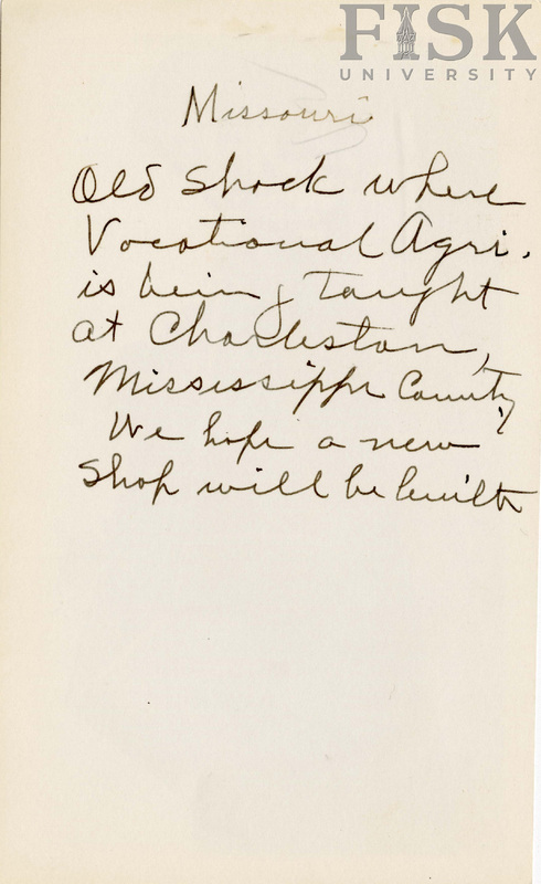 - Photo shows the front of an old shack that is used to teach in Mississippi, Missouri with a handwritten note on the back that says "Missouri. Old school where vocational Agri. is being taught at Charleston, Mississippi county. We hope a new shop will be built."