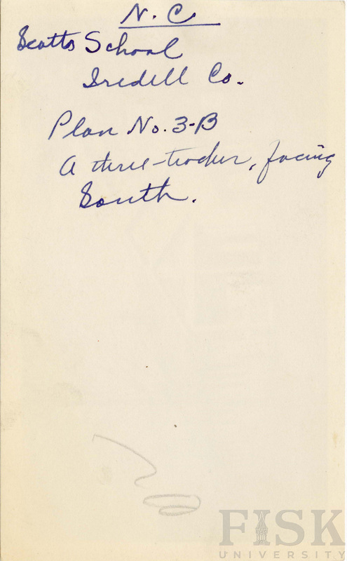 - Photo shows the front view of Scotts school in Iredell, North Carolina with notes on the back that says, "a three-teacher, facing south."