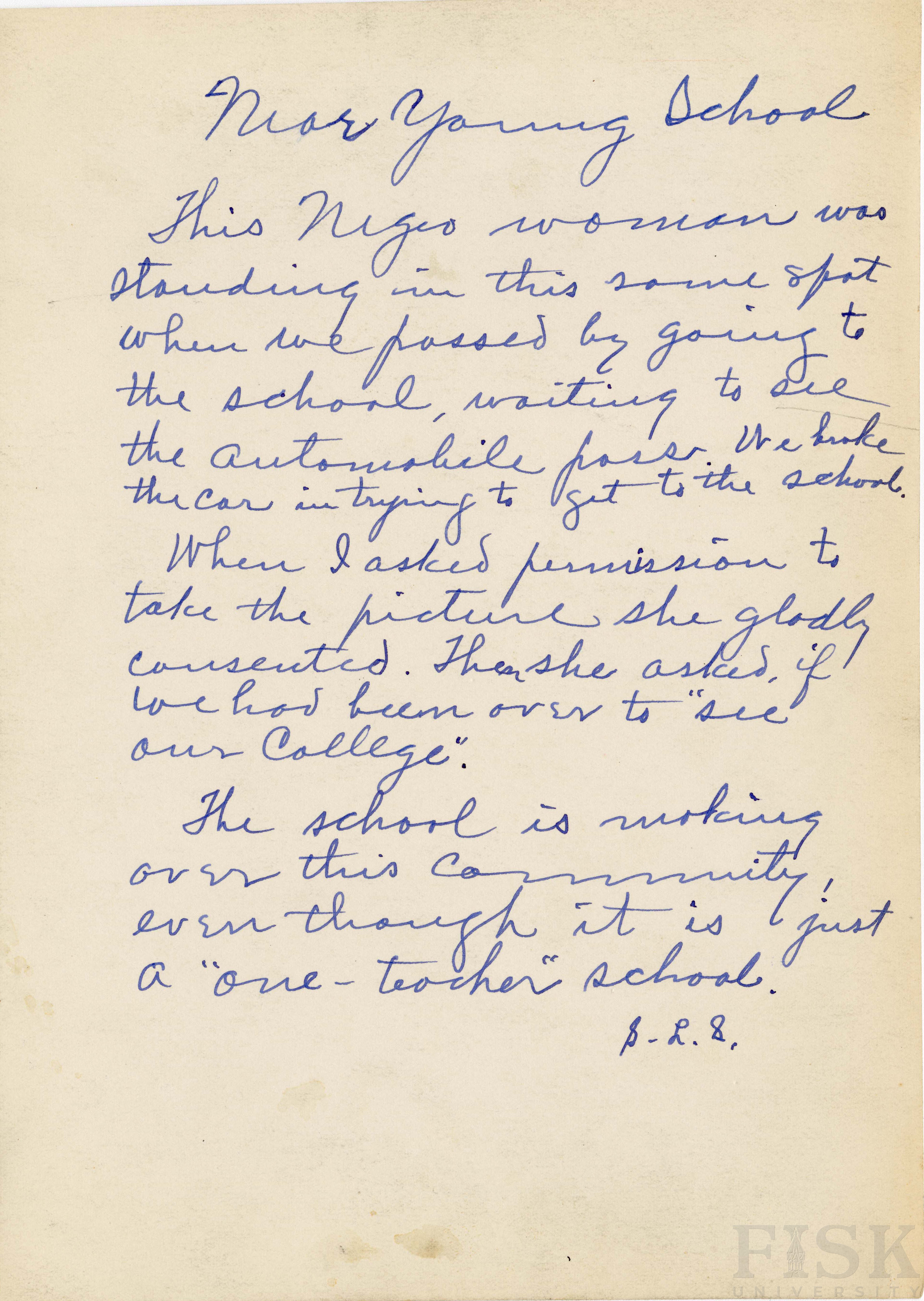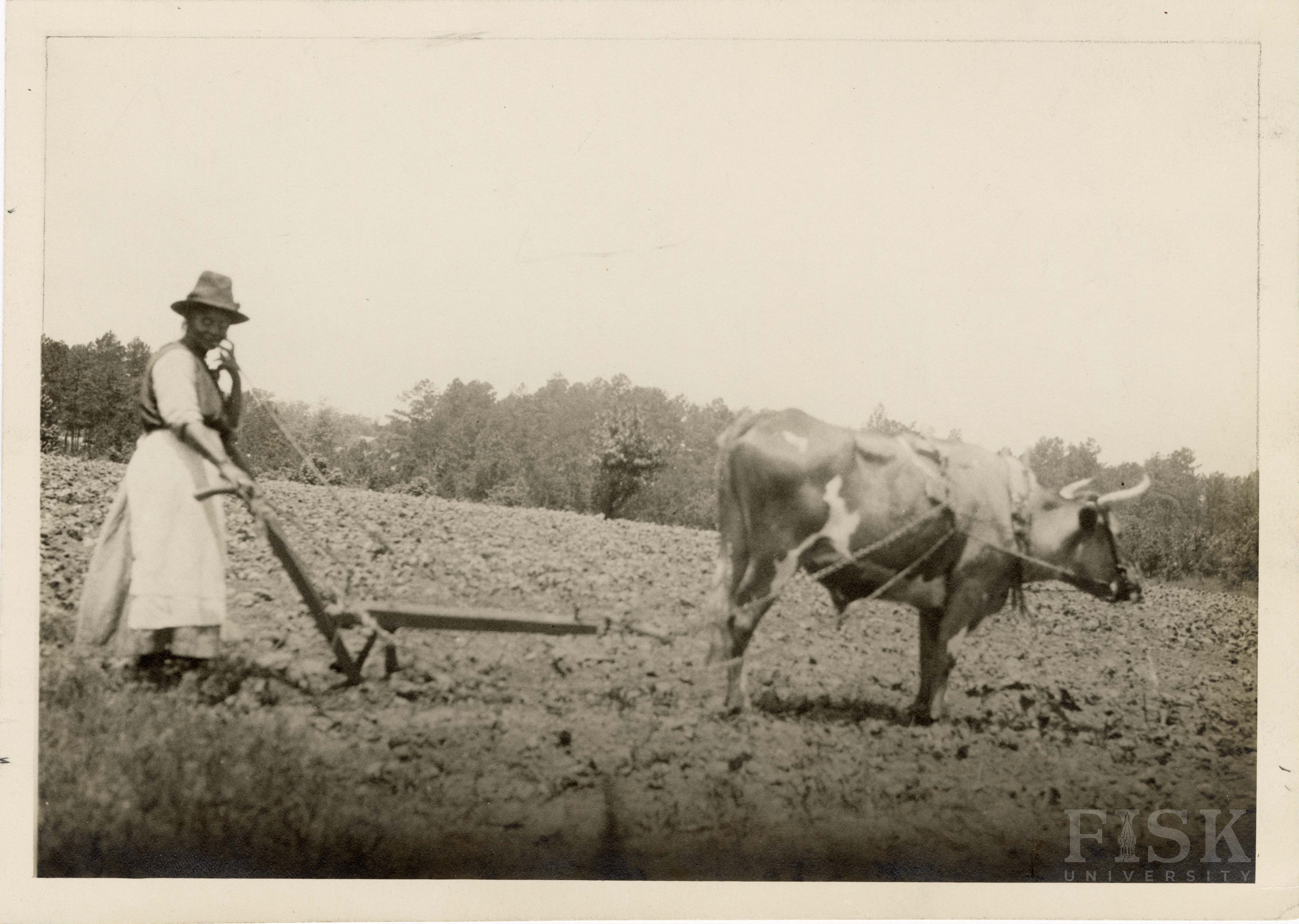 - Photo shows a woman tilling soil with a cow near the Young school in Warren, North Carolina with notes on the back that says "This Negro woman was standing in this same spot when we passed by going to the school, waiting to see the automobile pass. We broke the car in trying to get to the school. When I asked permission to take the picture she gladly consented. Then she asked if we had been over to "see our college." The school is making over this community, even though it is just a "one-teacher" school. S.L.S."