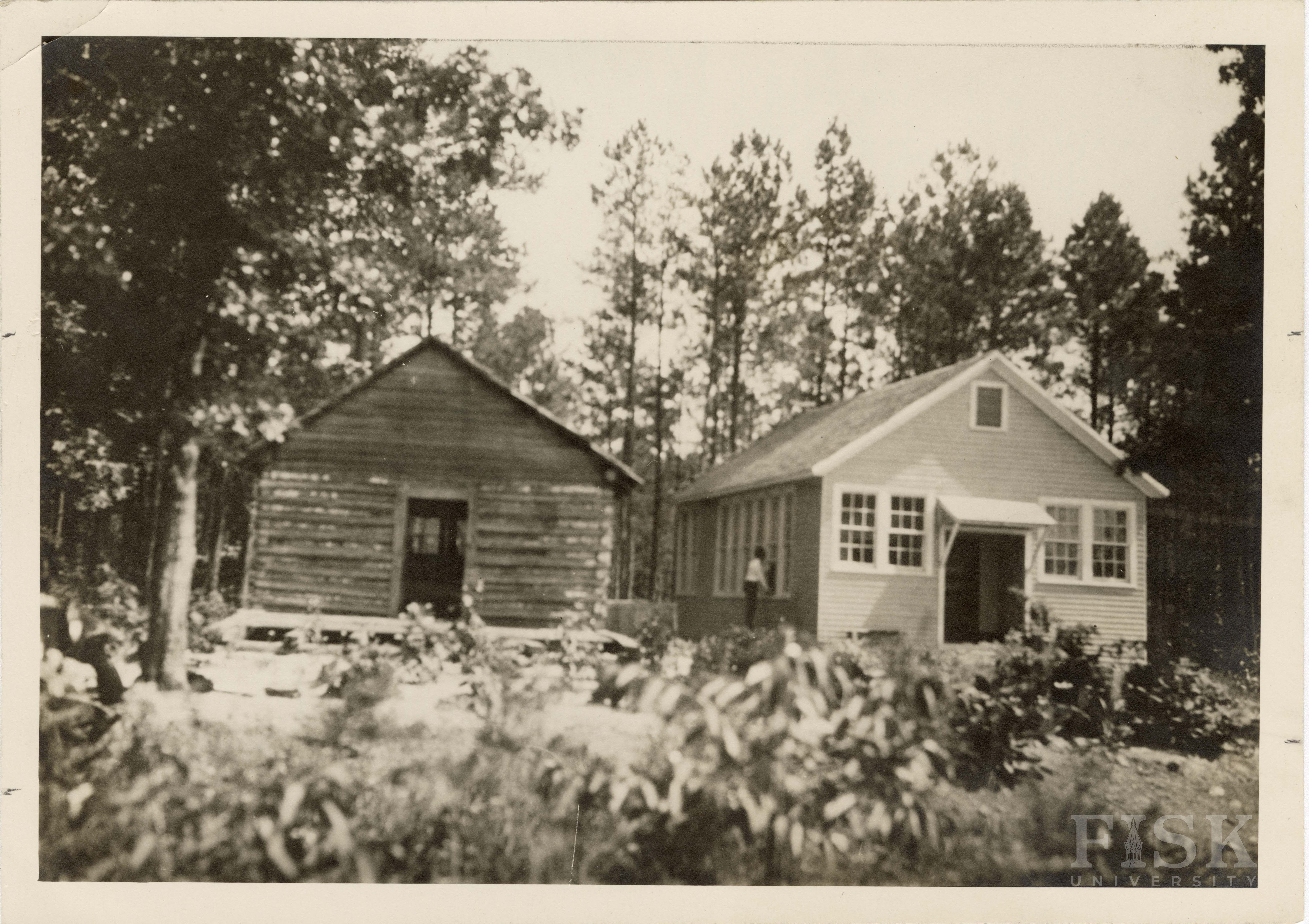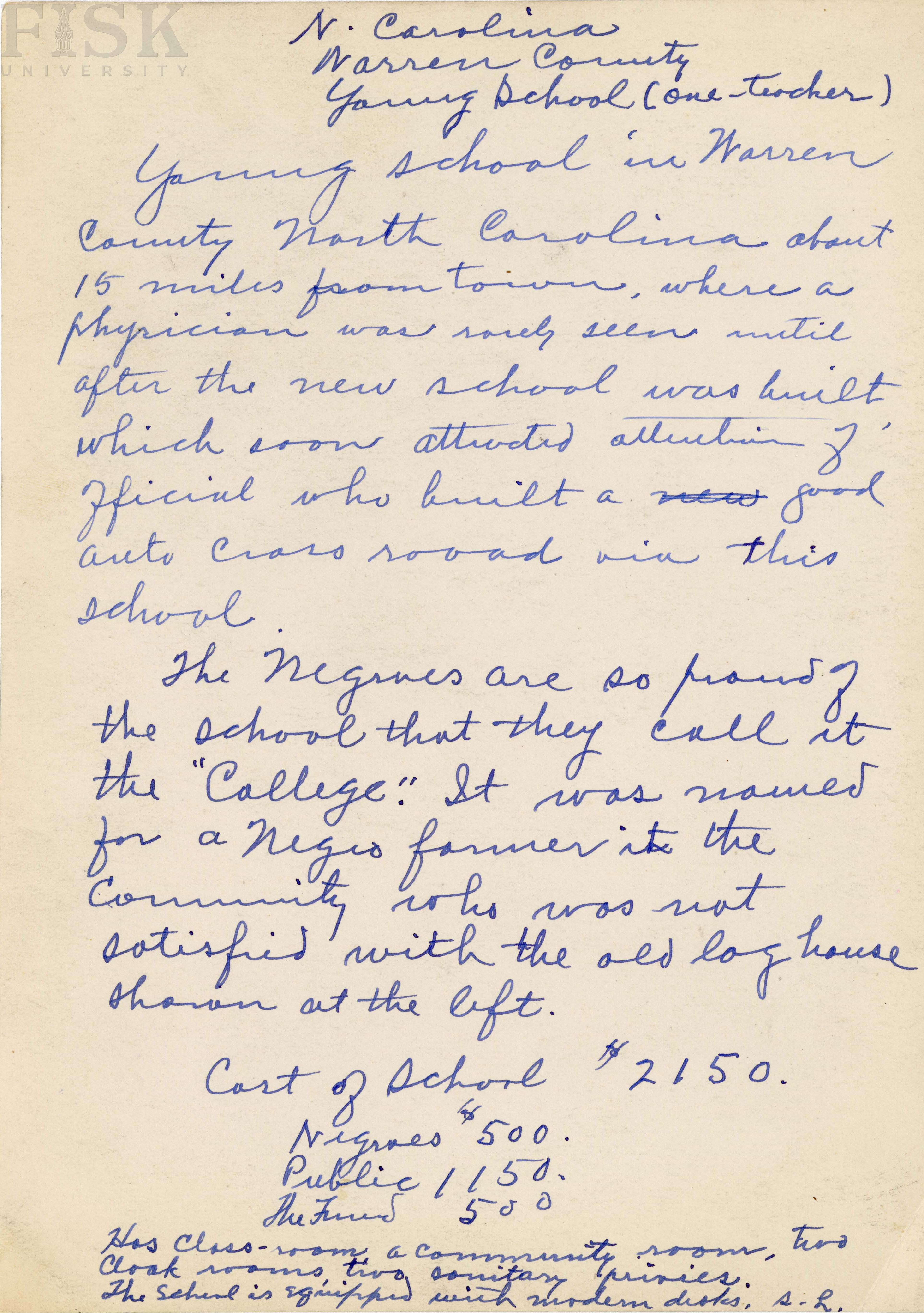 - Photo shows the front of both the old and newly built Young school in Warren, North Carolina with notes on the back that says "Young School in Warren County North Carolina about 15 miles from town, where a physician was rarely seen until after the new school was built which soon attracted attention of official who built a good auto cross road via this school. The Negroes are so prond of the school that they call it the "College". It was named for a negro farmer in the community who was not satisfied with the old log house shown at the left." An additional note identifies the "Cost of school $2150. Negroes $500. Public 1150. The Fund 500. Has classroom, a community room, two cloak rooms, two sanitary privies. The school is equipped with modern desks. SL."