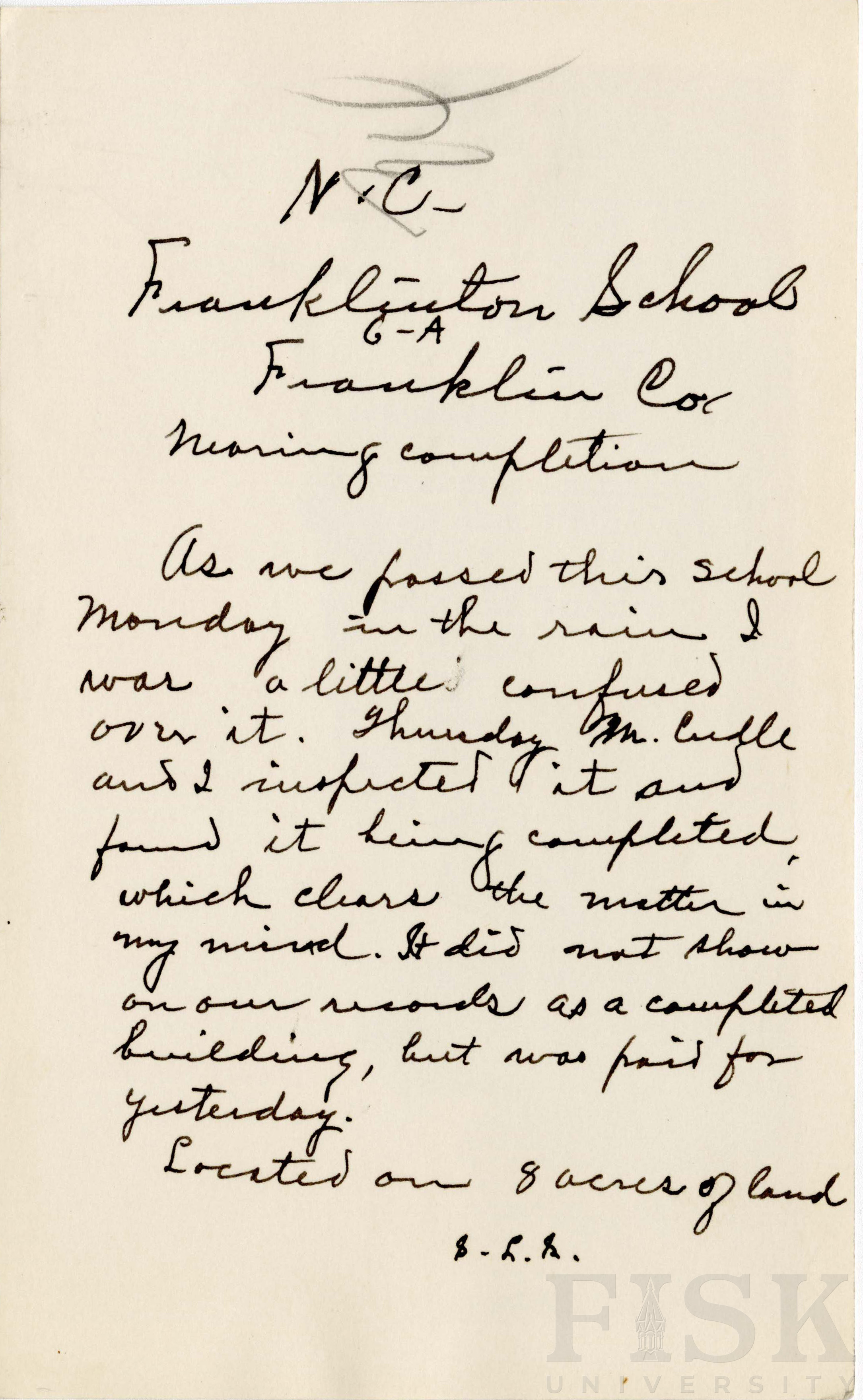 Photo shows newly constructed Franklinton school in Franklin, North Carolina with notes on the back that says "as we passed this school Monday in the rain I was a little confused over it. Thursday Mr. Cudle and I inspected it and found it being completed, which clears the matter in my mind. It did not show on our records as a completed building, but was paid for yesterday. Located on 8 acres of land. - S.L.S."