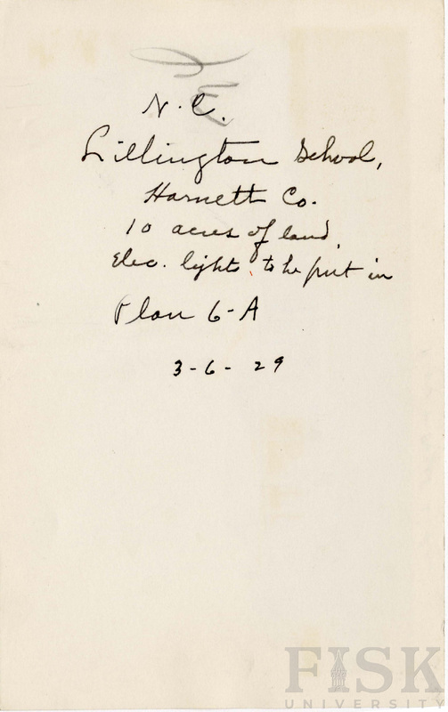 - Photo shows the rear view of Lillington school in Harnett school in Lillington, North Carolina with notes on the back that says "10 acres of land. [ineligible] [ineligible] [ineligible] to the [ineligible] in [ineligible] 6.A 3-6-29"