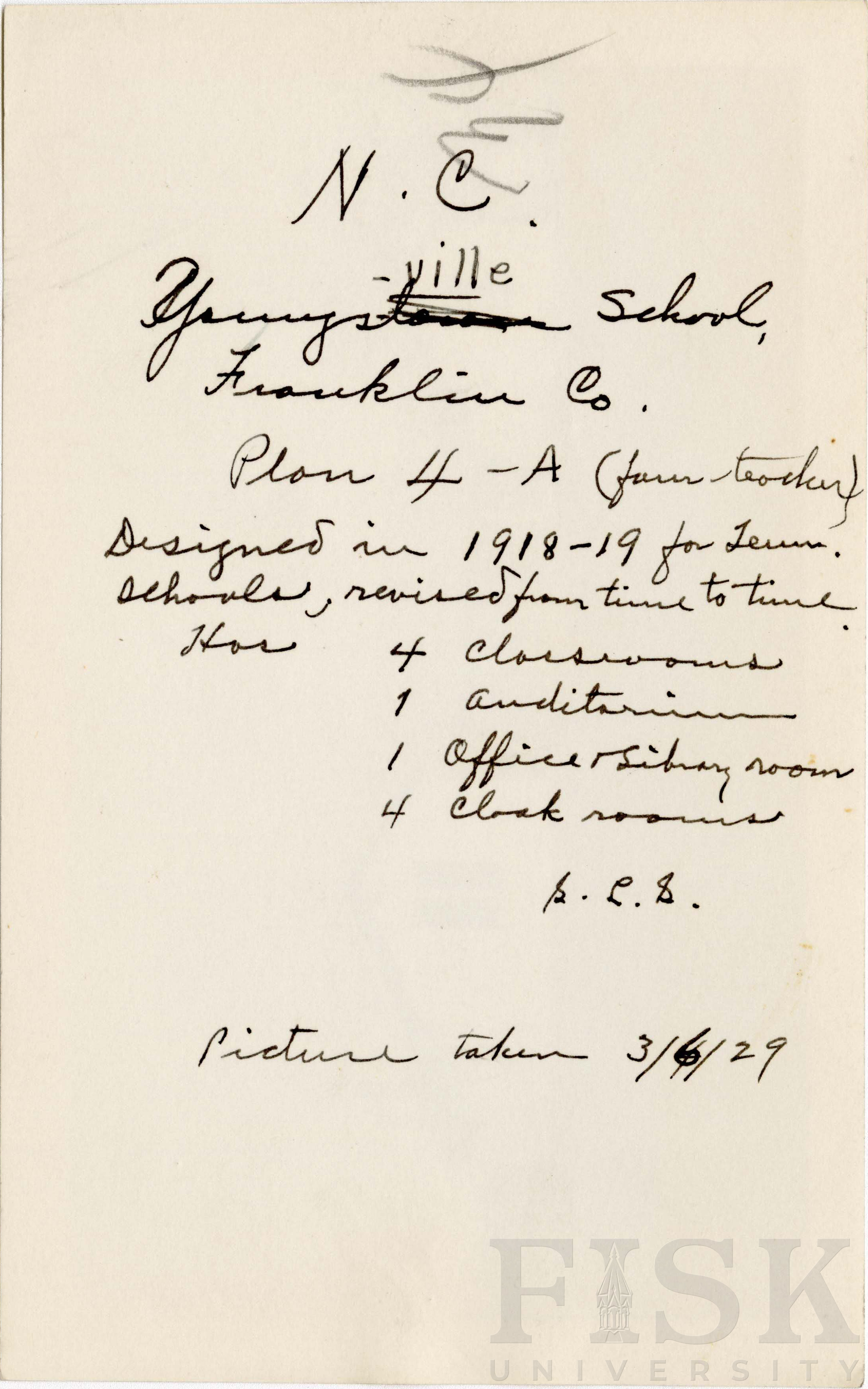 - Photo shows a newly constructed Youngville school in Franklin, North Carolina with notes on the back that says "Plan 4-A (four-teacher). Designed in 1918-19 for Tenn. schools, revised from time to time. Has 4 classrooms 1 auditorium 1 office + library room 4 cloak rooms S.L.S. Picture taken 3/6/29"