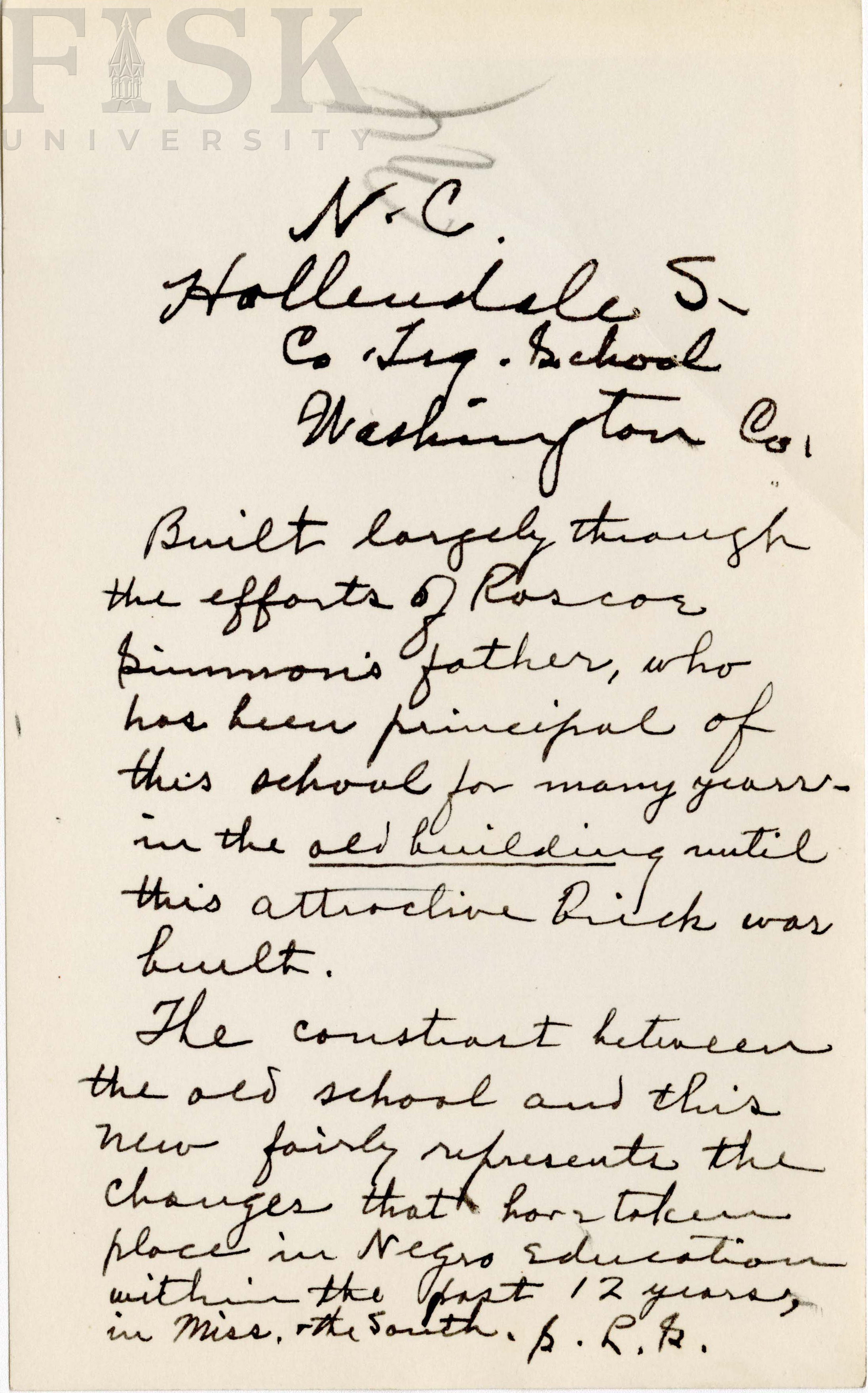 - Photo shows the front of Hollendale school in Washington, North Carolina with notes on the back that says "Built largely through the efforts of Roscoe Simmon's father, who has been principal of this school for many years in the old building until this attractive brick was built. The contrast between the old school and this new fairly represents the changes that have taken place in Negro Education within the past 12 years, in Miss. + the South. S.L.S."