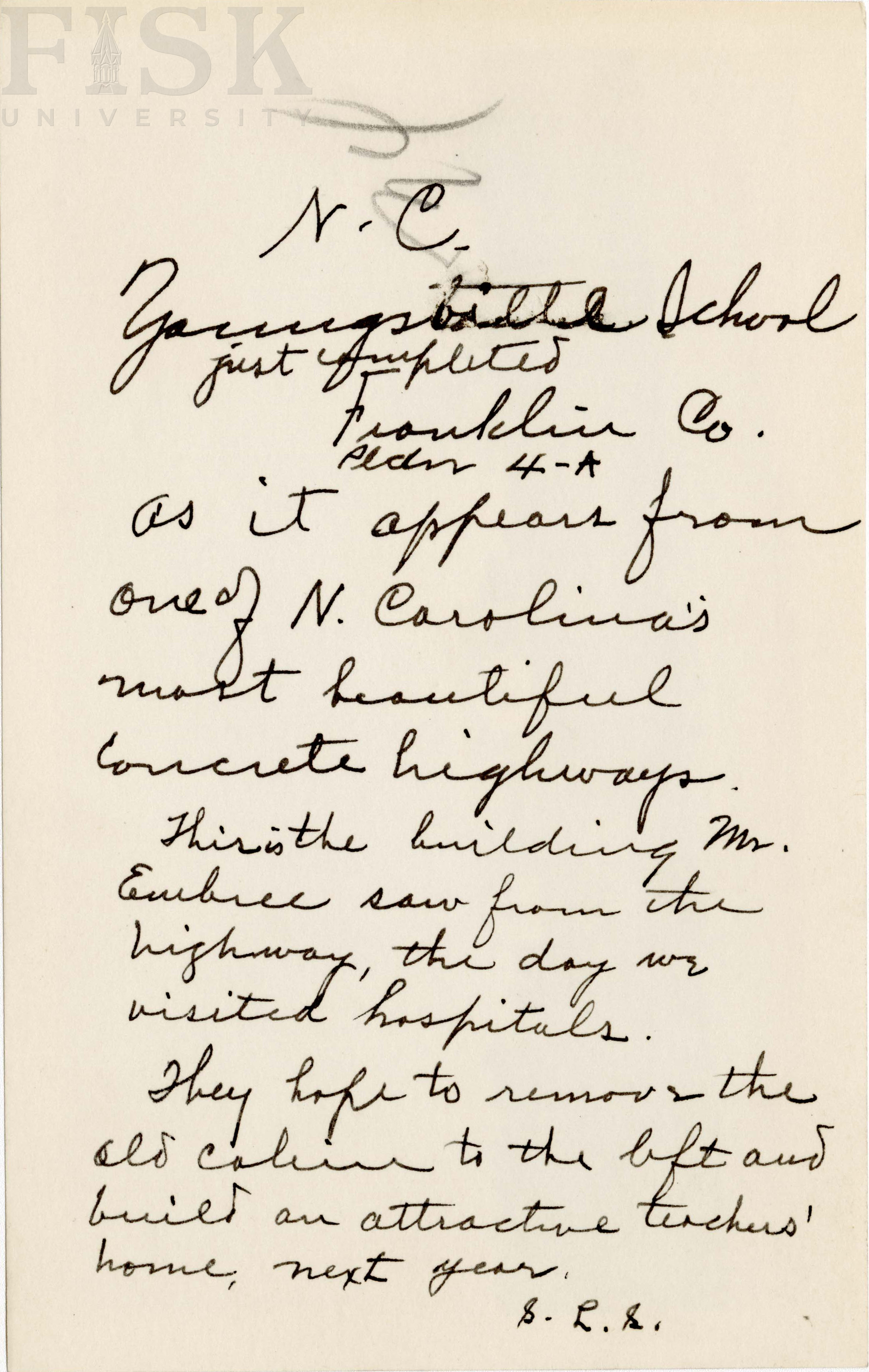 Photo shows the front of Youngville school along with an old cabin with notes on the back that says "As it appears from one of N. Carolina's most beautiful concrete highways. This is the building Mr. Embree saw from the highway, the day we visited hospitals. They hope to remove the old cabin to the left and build an attractive teachers' home next year. S.L.S."