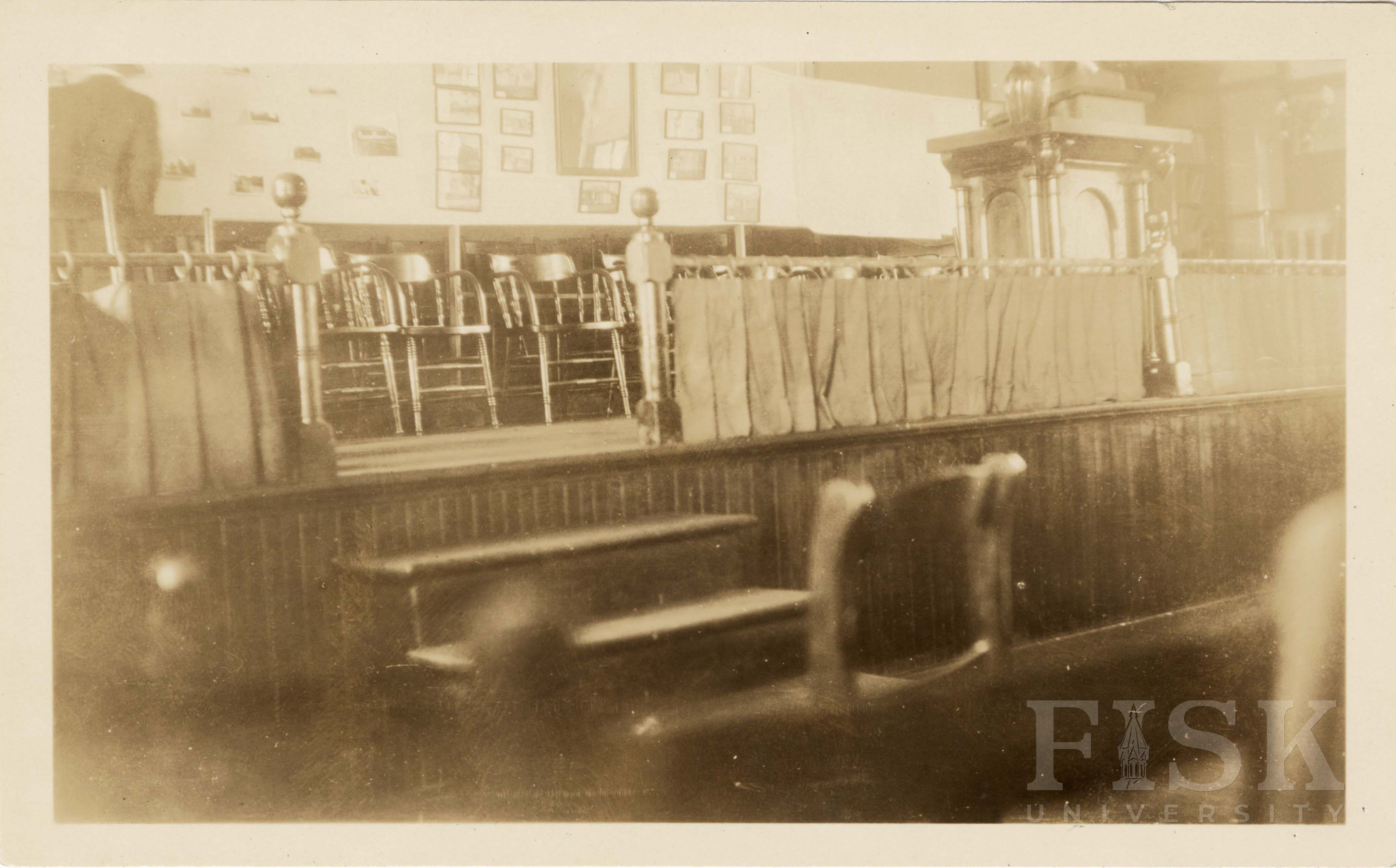 Photo shows a collection of rosenwald pictures on a wall at Shaw University's chapel in Raleigh, North Carolina with a note on the back that says "Shaw University Chapel at the time of the Conference. A group of Rosenwald Pictures are shown."