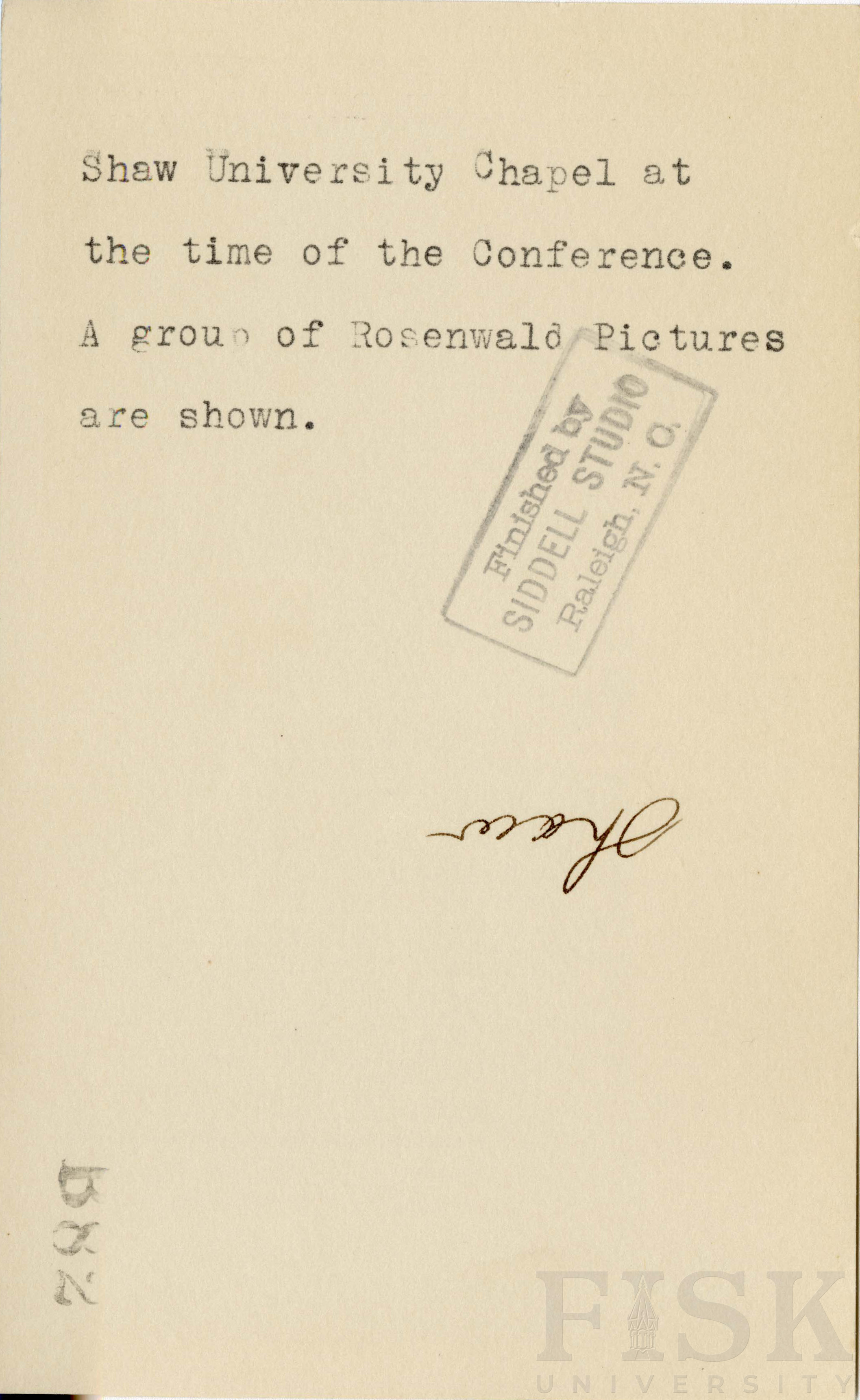- Photo shows a collection of rosenwald pictures on a wall at Shaw University's chapel in Raleigh, North Carolina with a note on the back that says "Shaw University Chapel at the time of the Conference. A group of Rosenwald Pictures are shown."