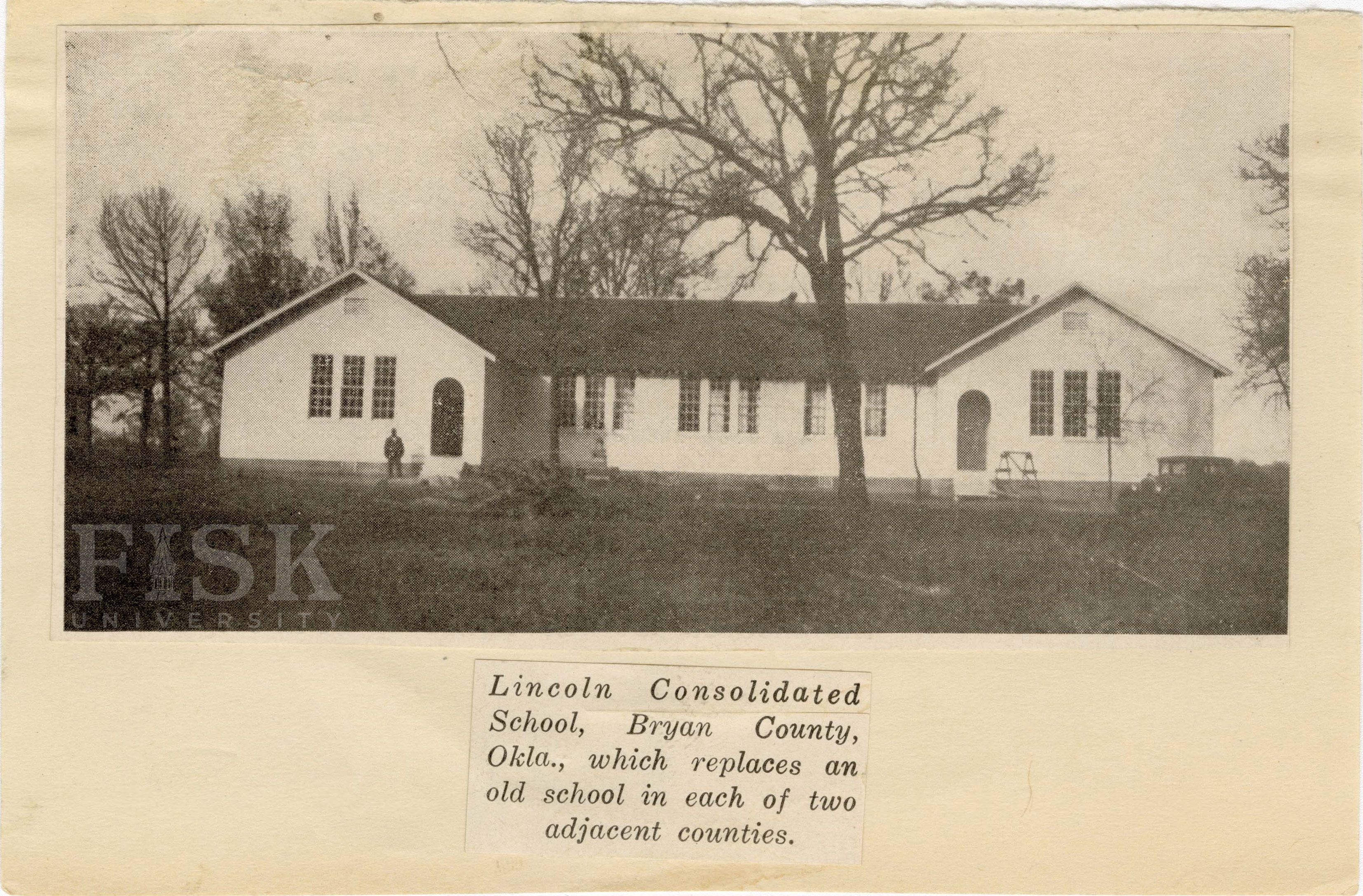 - Photo shows Lincoln Consolidated school in Bryan, Oklahoma with a note below it that says "Lincoln Consolidated School, Bryan County, Okla., which replaces an old school in each of two adjacent counties."