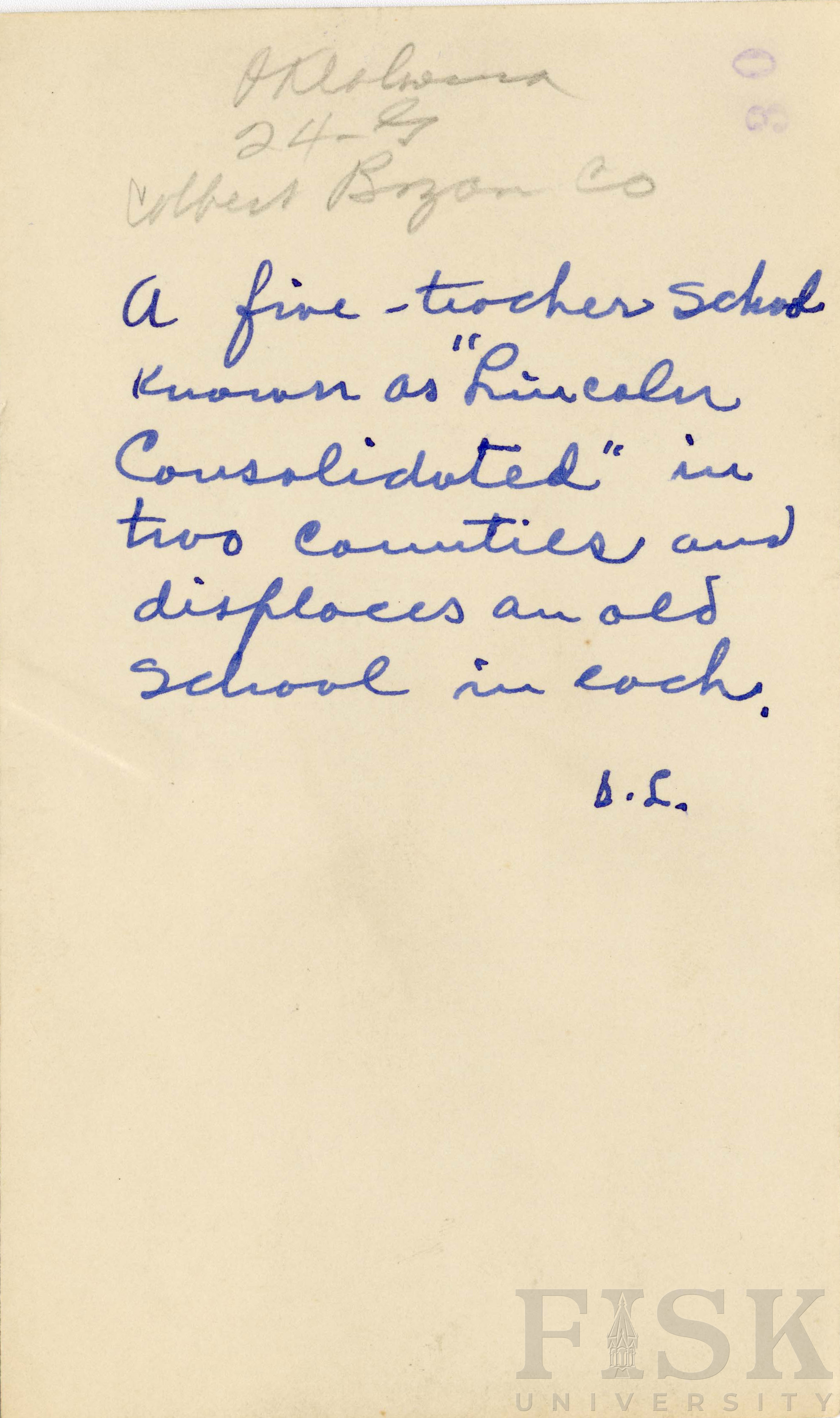 - Photo shows a distant view of Lincoln Consolidated school in Bryan, Oklahoma and a handwritten note on the back that says "A five teacher school known as "Lincoln Consolidated" in two counties and displaces an old school in each. S.L."