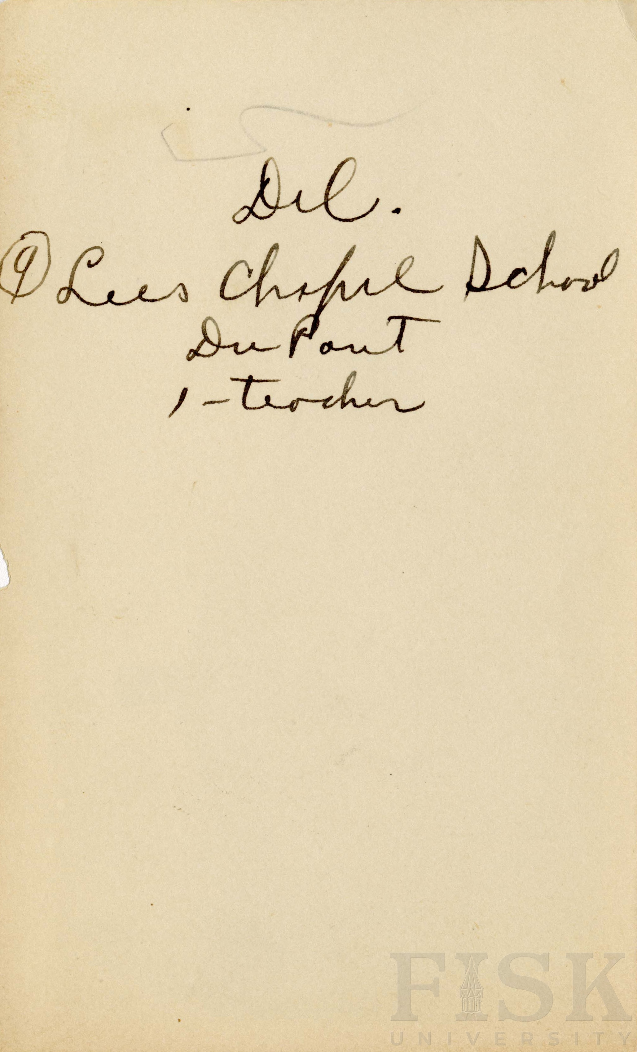 - Photo shows a rear view of Lees Chapel School with a note on the back that says, "Del. Lees Chapel school , Du Pont, 1-teacher"