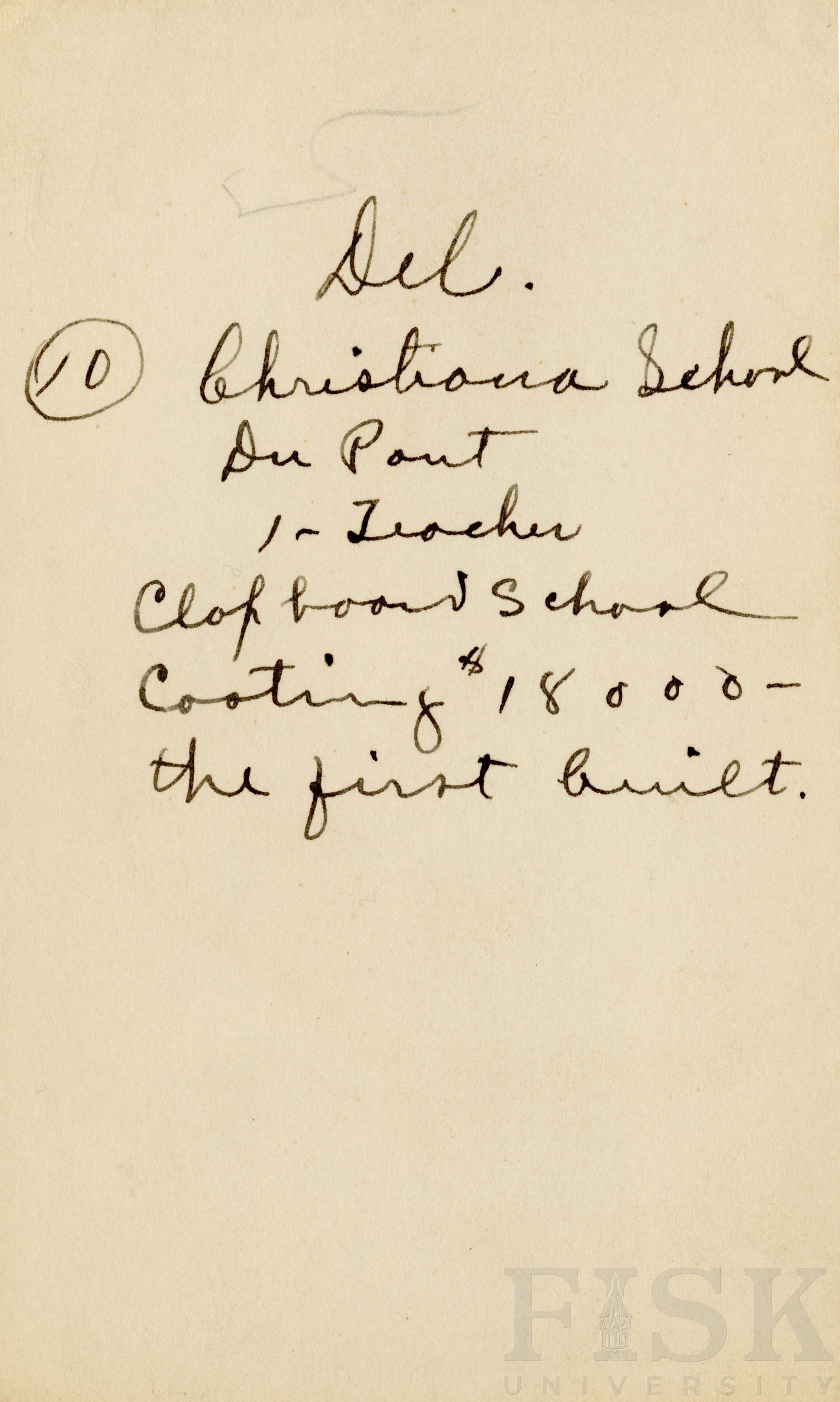- Photo shows the front view of Christiana School with notes on the back that says "Del Christiana School Du Pont 1- Teacher Clapboard school costing of $18000 - the first built"