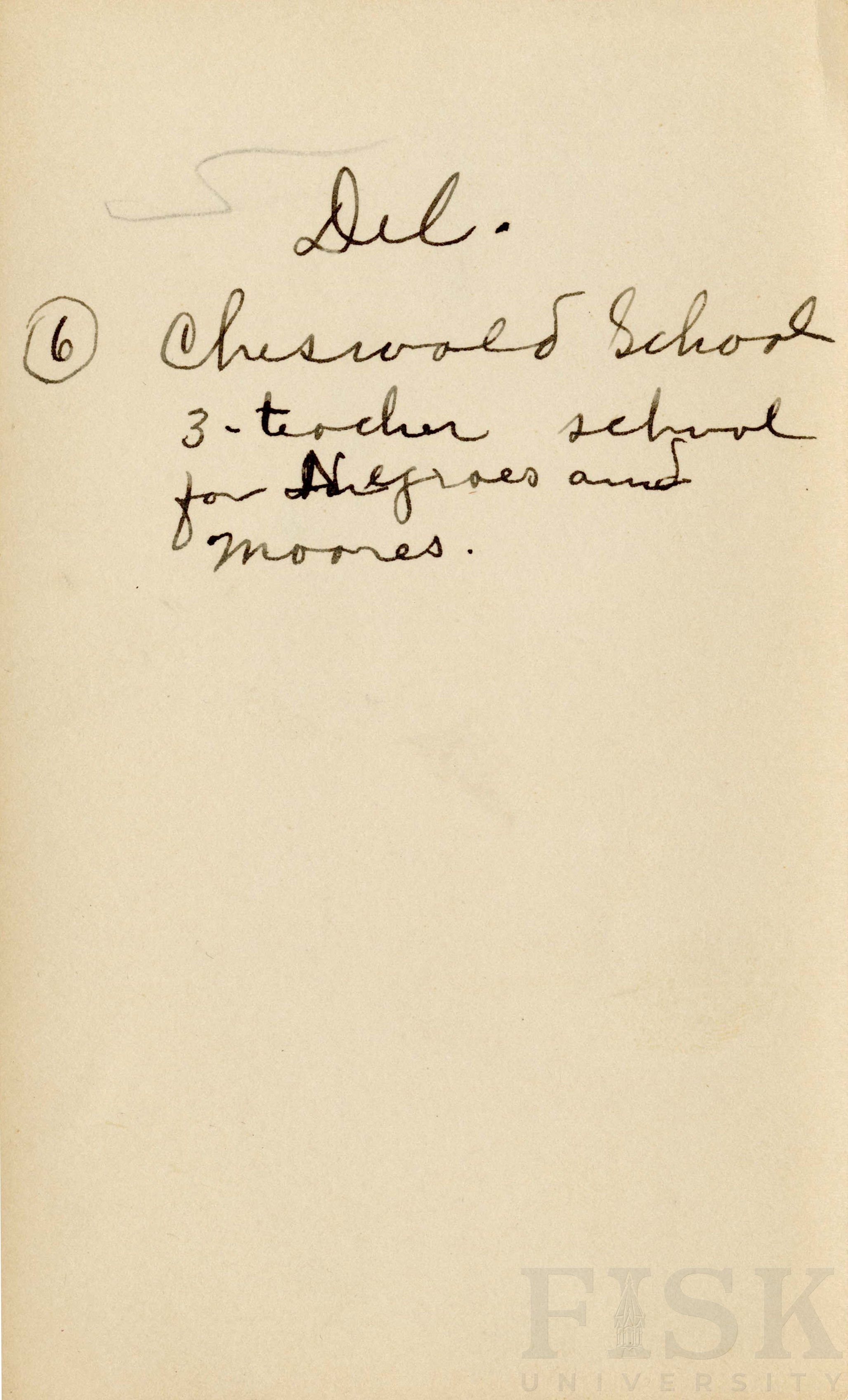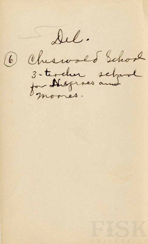 - Photo shows a rear view of Cheswald School with notes on the back that says "Del 3-teacher school 3-teacher school for Negroes and Moores."