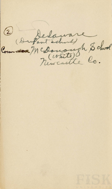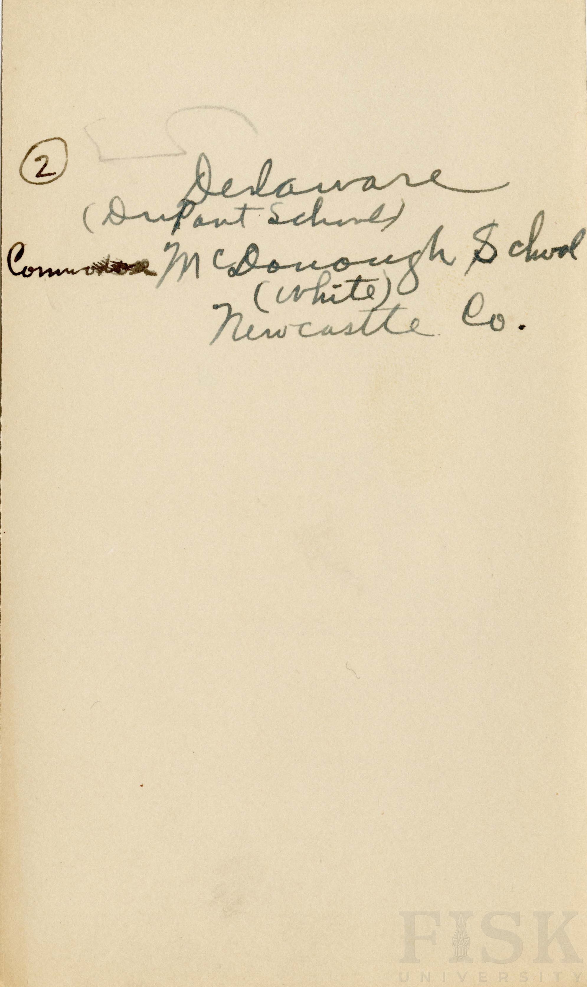 - Photo shows a distant view of McDonough school in New Castle, Delaware. A note on the back reads, "Delaware (DuPont School) Commodore McDonough School (White) New Castle Co."