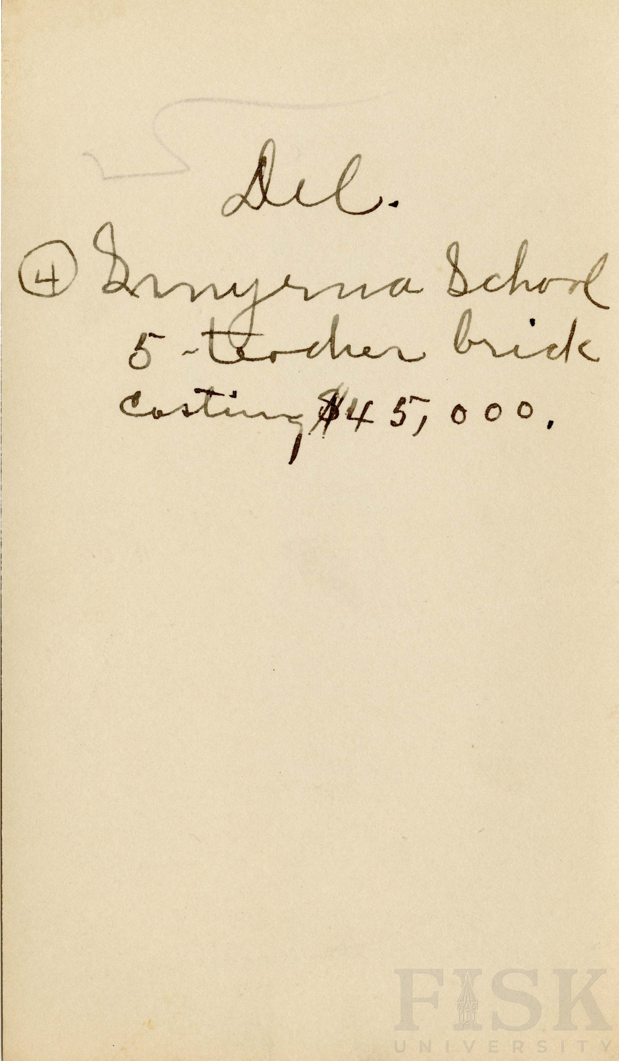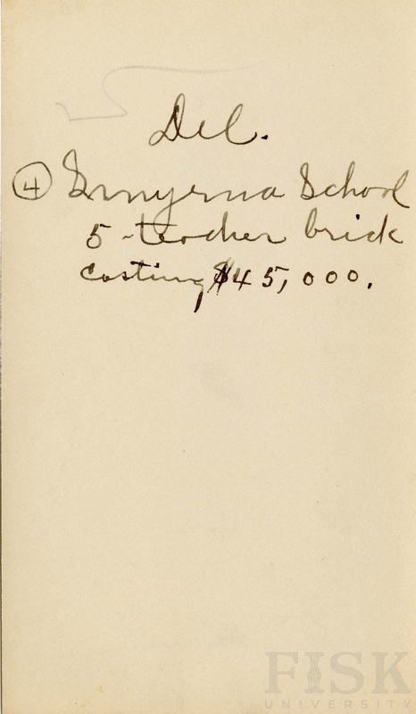 Photo shows a distant view of Smyrna School with notes on the back that says "Del. Smyrna School 5-teacher brick costing $45,000."