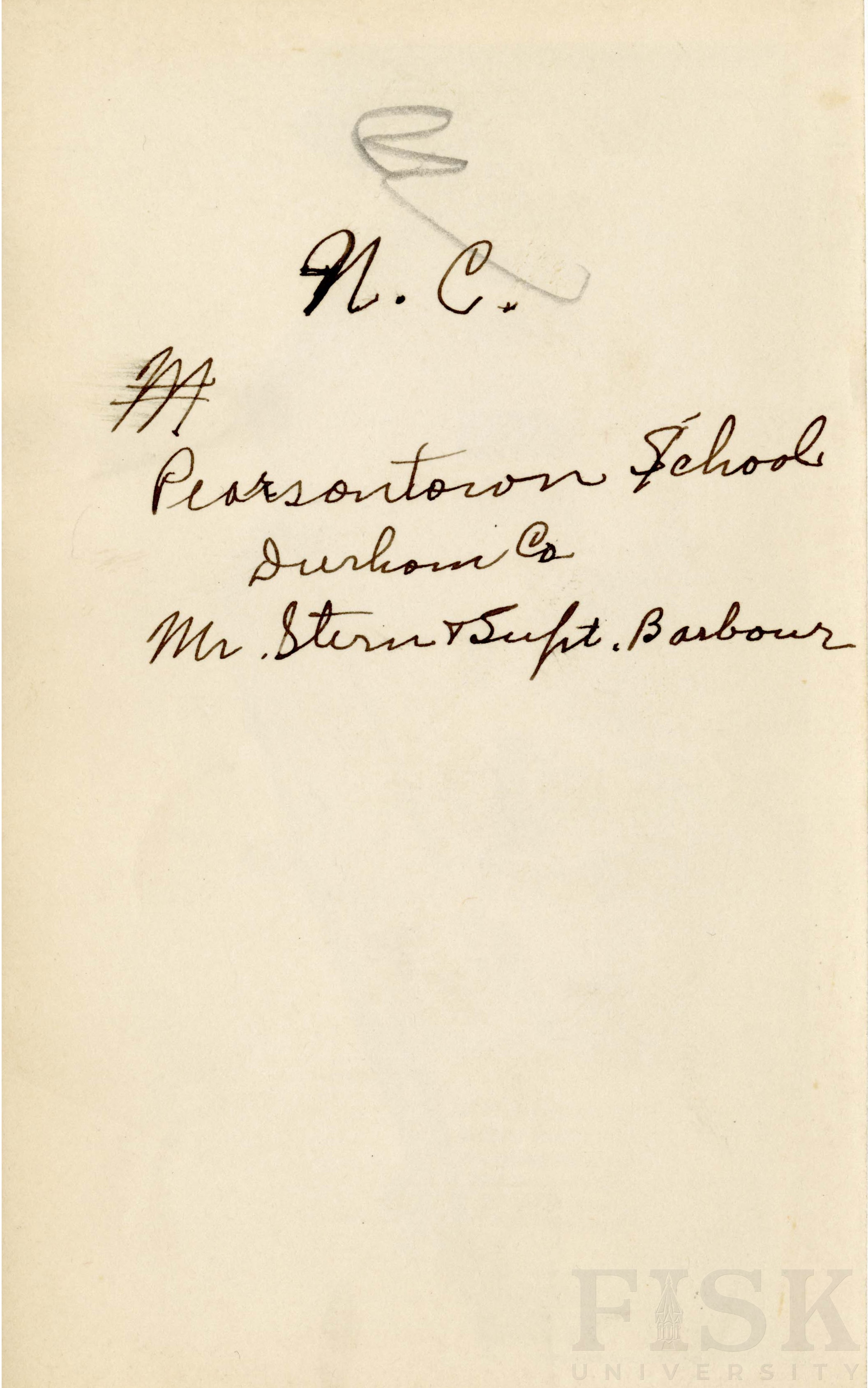 - Photo shows Mr. Alfred K. Stern and Superintendent Barbour outside of Pearsontown School in Durham County, North Carolina.