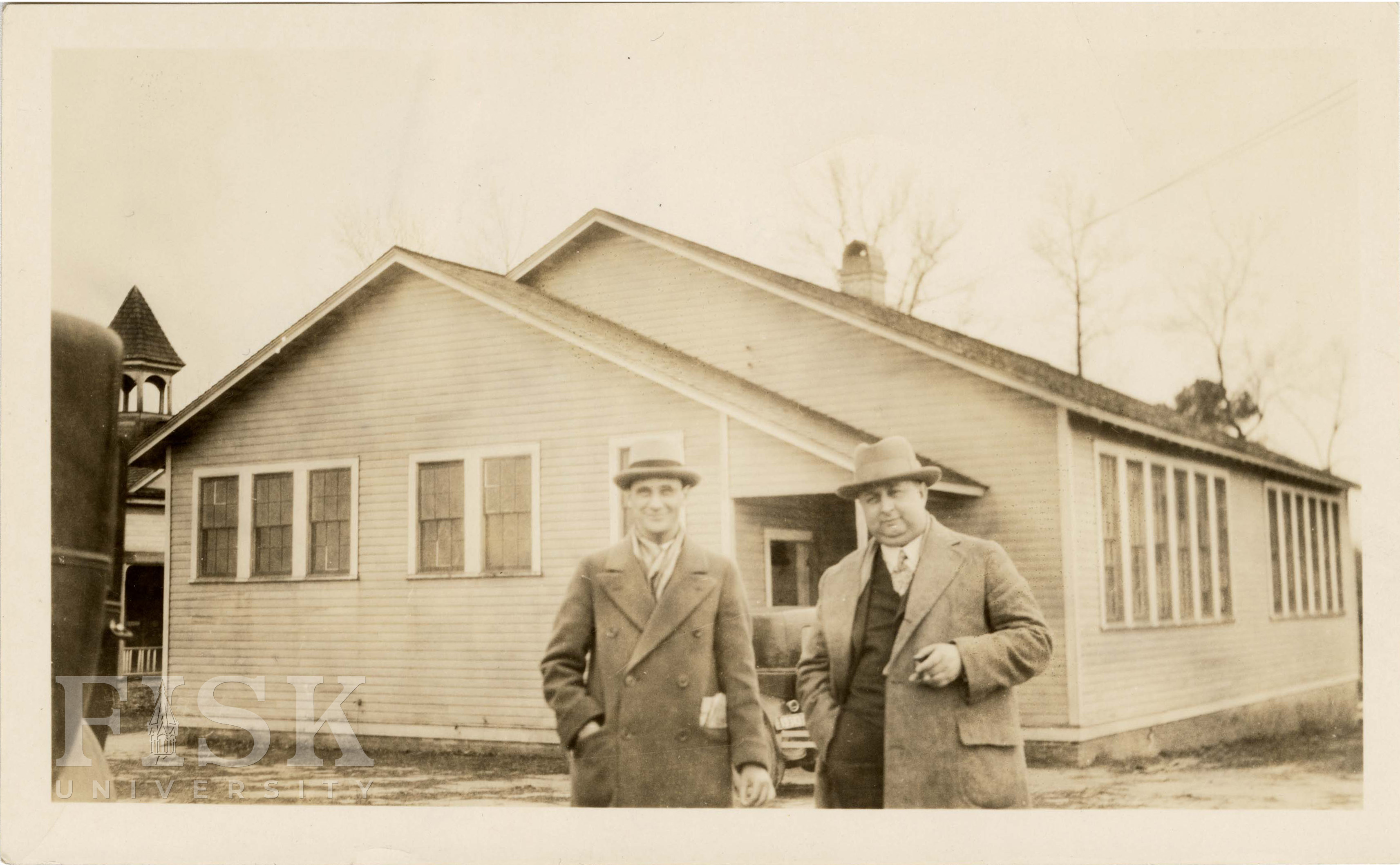 Photo shows Mr. Alfred K. Stern and Superintendent Barbour outside of Pearsontown School in Durham County, North Carolina.