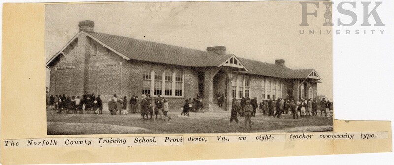 - A newspaper clipping showing students outside of Norfolk County Training school along with description in Providence, Virginia.