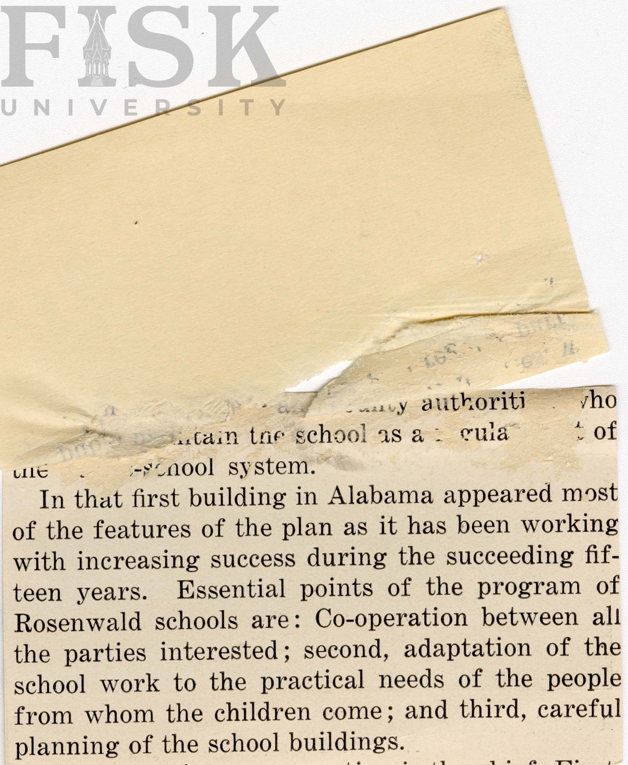 News clipping explains the progress of the creation of school infrastructure based on "that first building in Alabama."