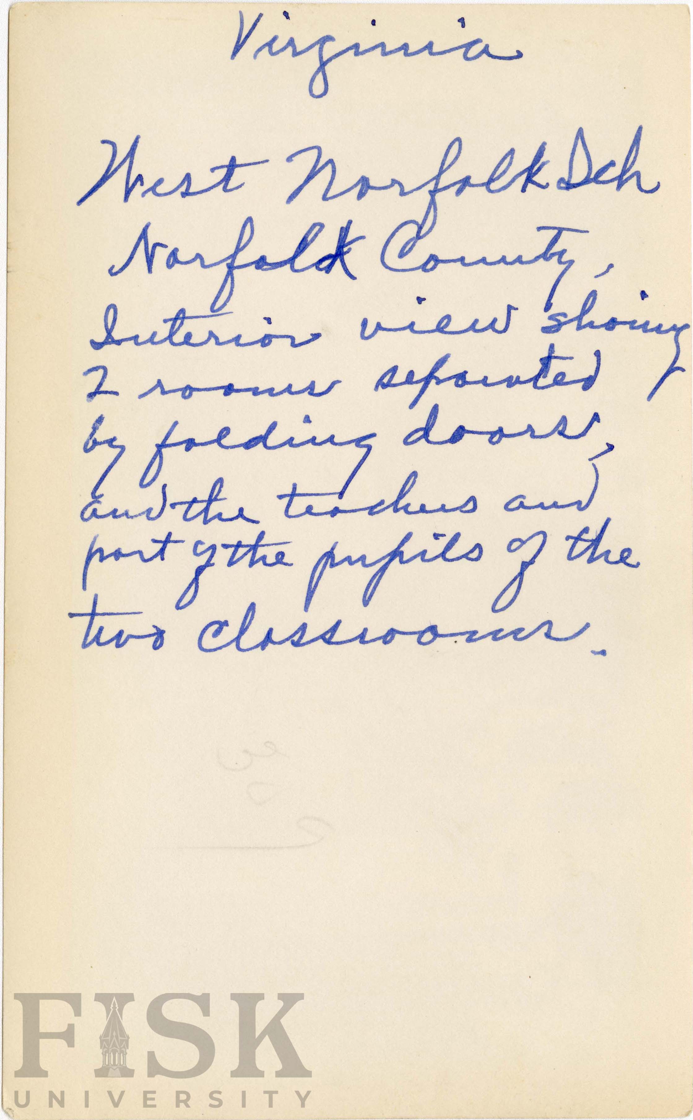 - Photo shows students and teachers inside of a classroom at West Norfolk school in Norfolk, Virginia. A note on the back says, "West Norfolk school in Norfolk County, Interior view showing 2 rooms separated by folding doors, and the teachers and part of the pupils of the two classrooms."