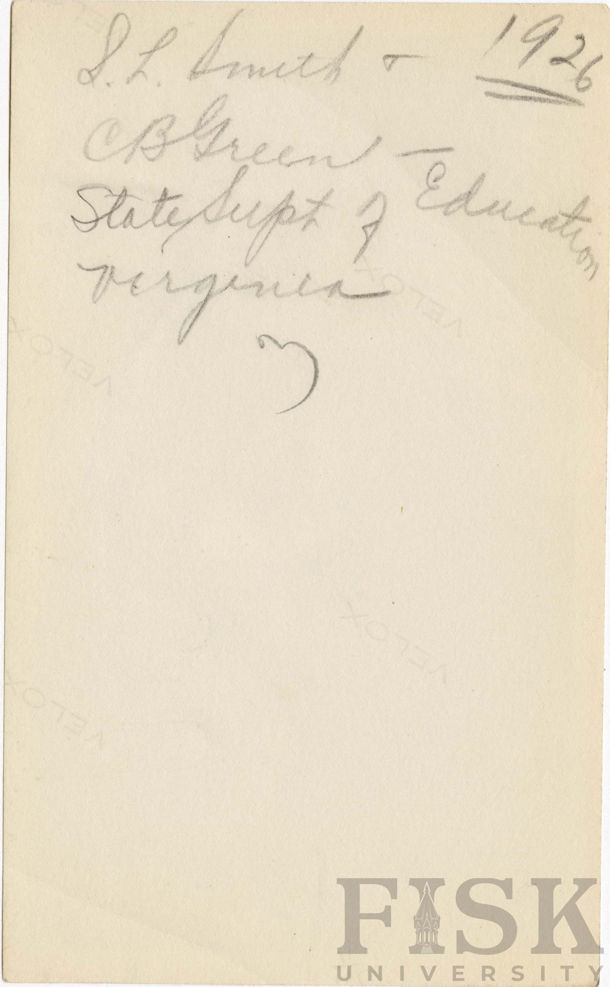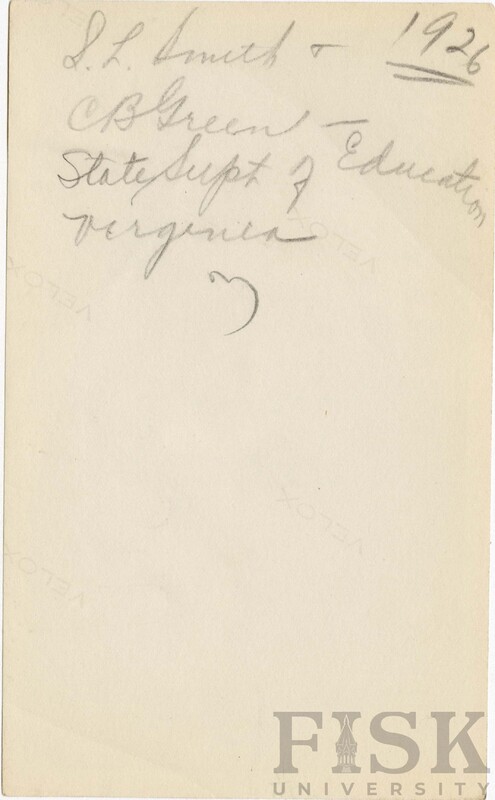 - Photo shows Southern Schools Agent S.L. Smith and Virginia State Superintendent of Education, C.B. Green.