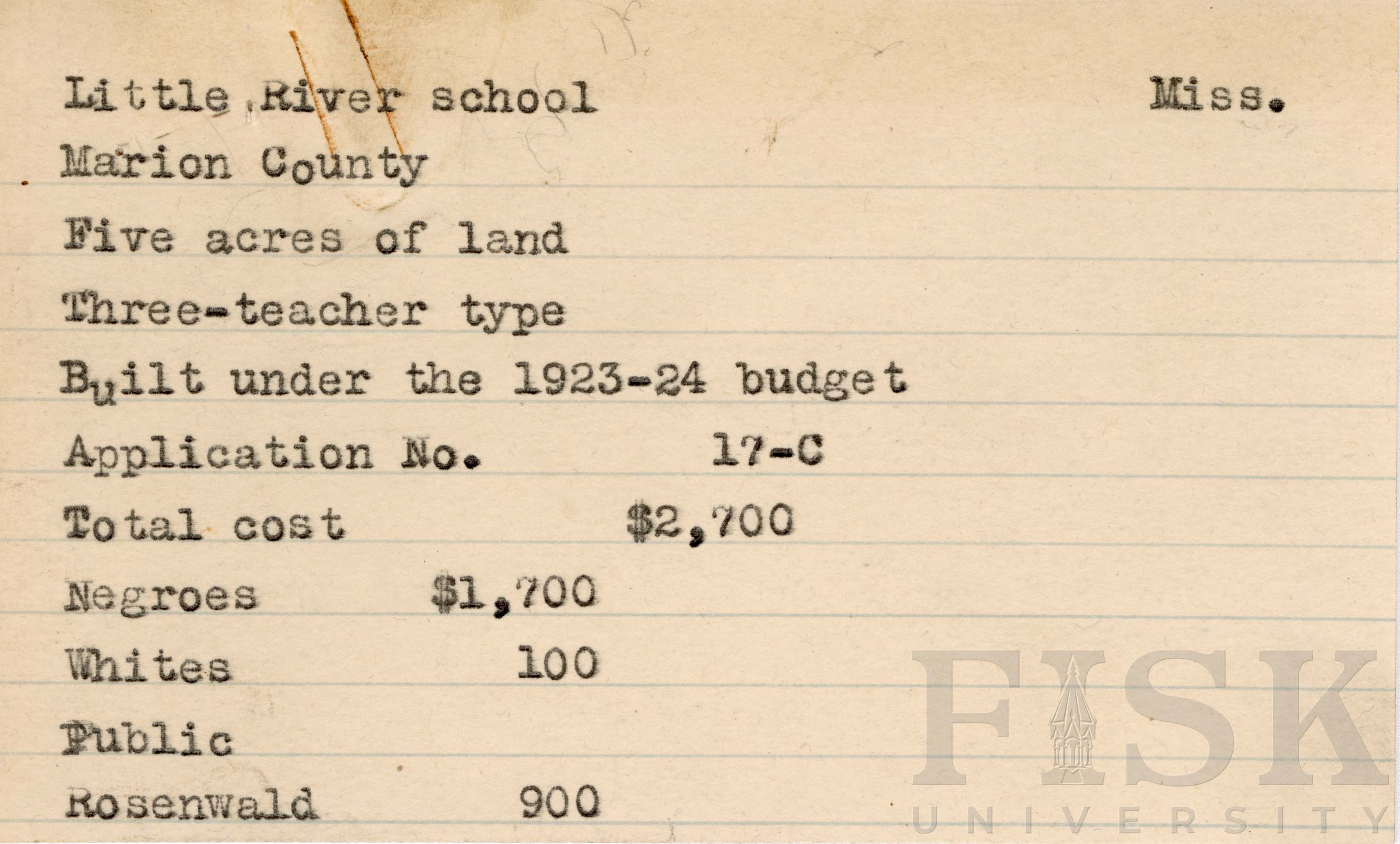 Photo of Fund Card of Little River School in Marion County, Mississippi