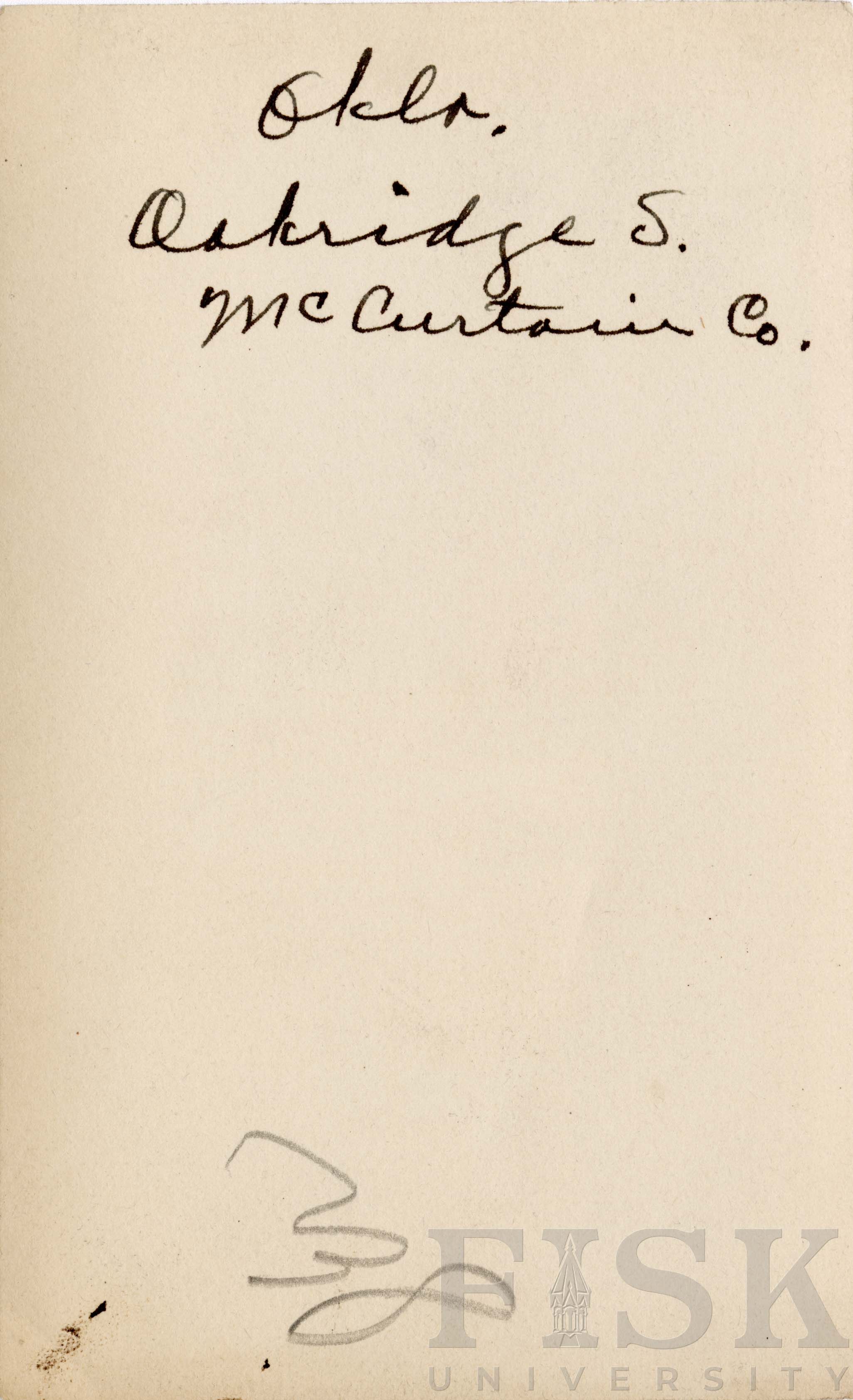 - Photo of Oakridge School in McCurtain County, Oklahoma. A handwritten note on the back says, "Okla. Oakridge S. McCurtain Co." and there is illegible pencil writing on the bottom.