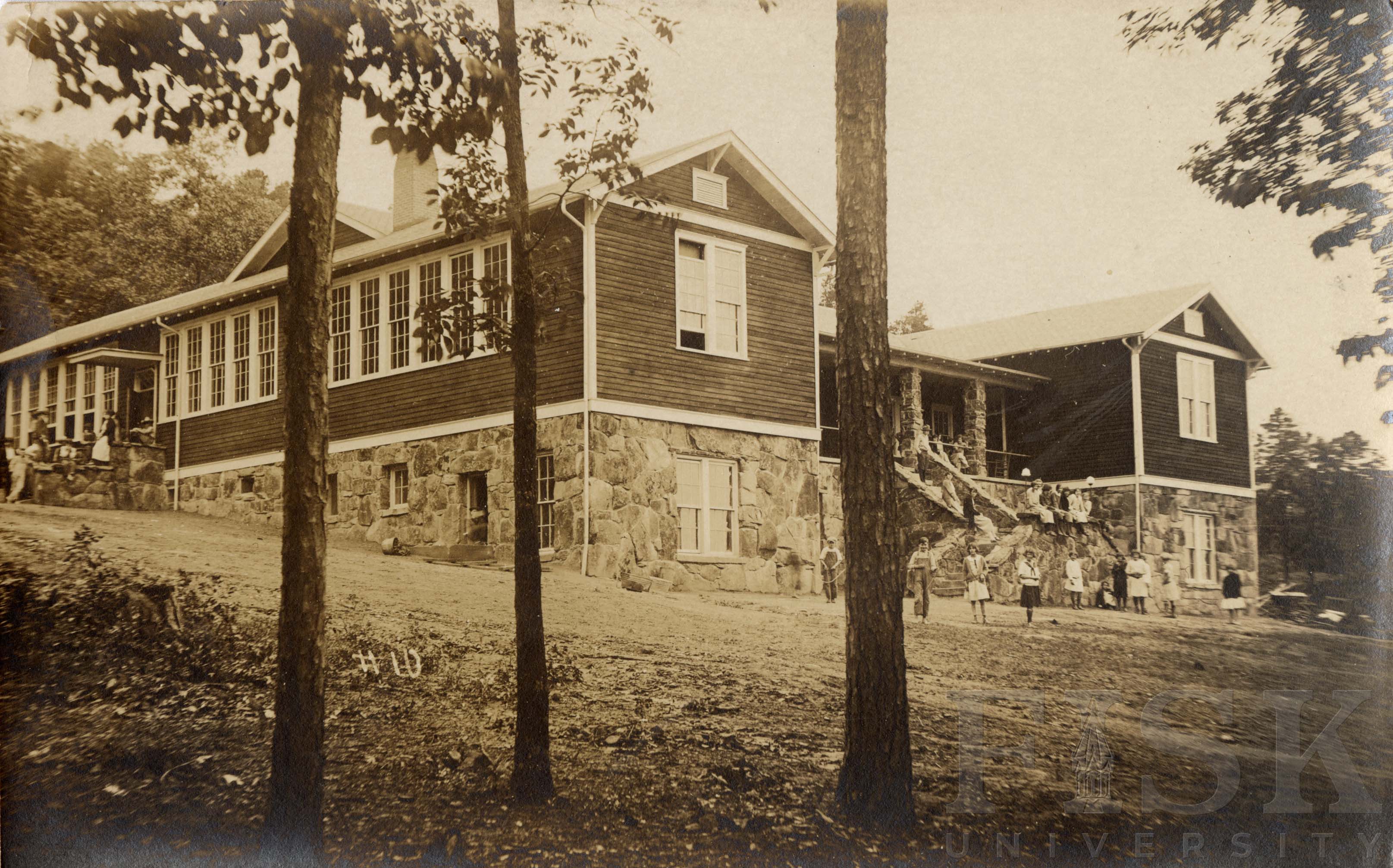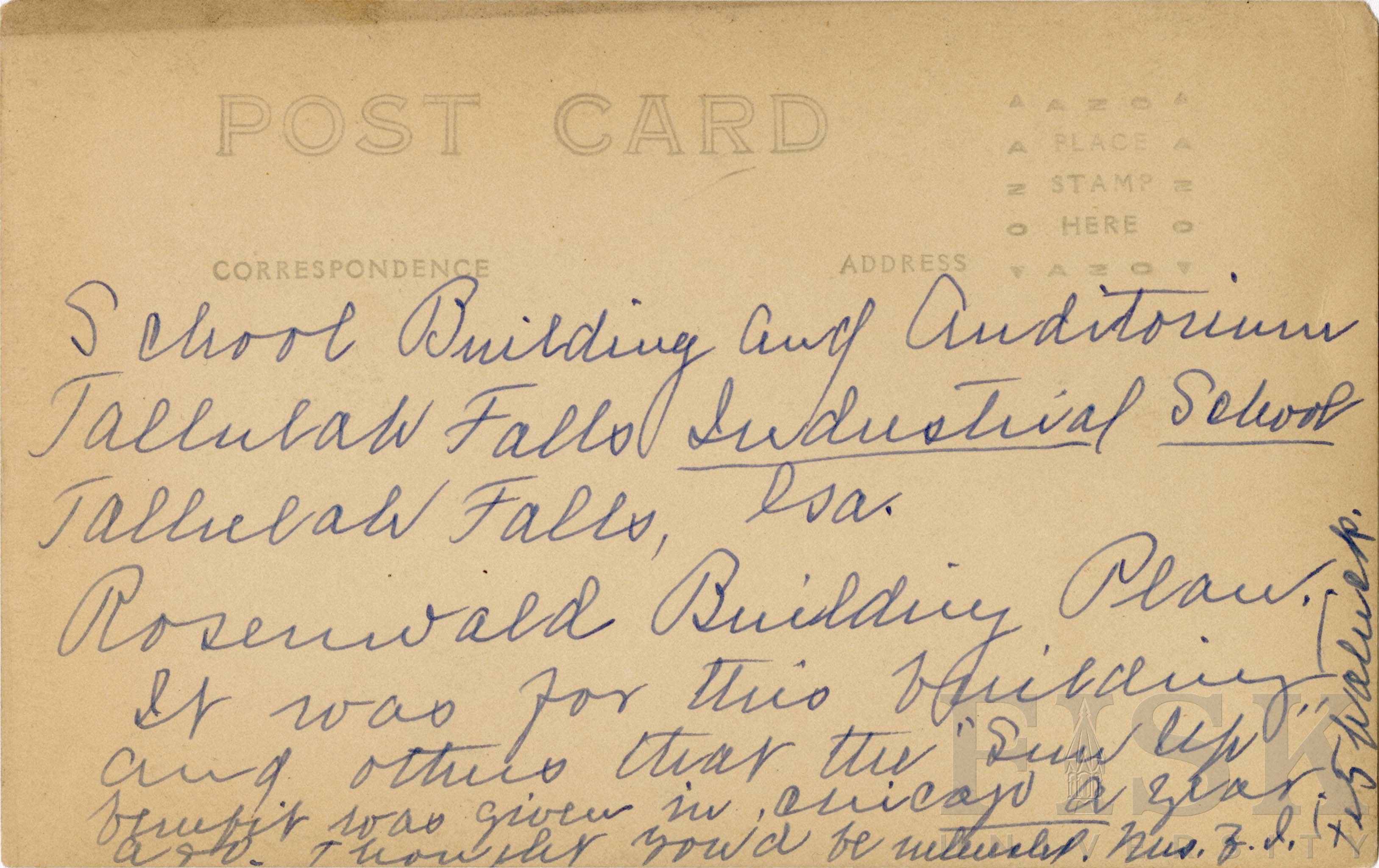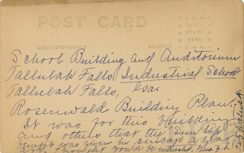 - Photo of school building and auditorium at Tallulah Falls Industrial School, Habersham County and Rabun County, Georgia. A handwritten note on the back says, " School Building and Auditorium. Tallulah Falls Industrial School Tallulah Fallls, Ga. Rosenwald Building Plan. It was for this building and others that the "Sun Up" benefit was given in Chicago a year ago." The last sentence and signature is illegible.