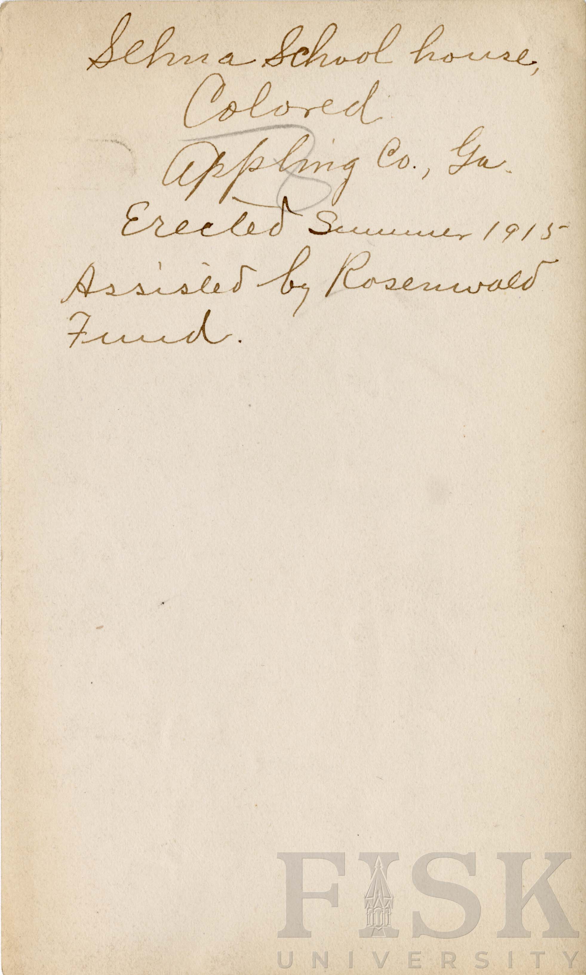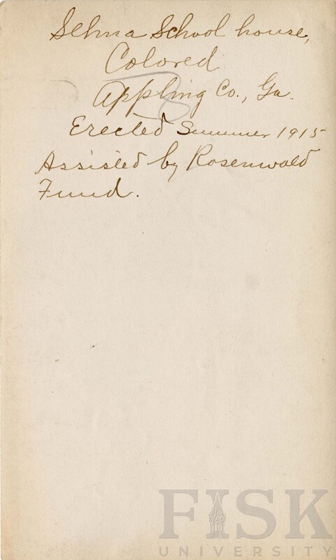 - Photo of Selma School House, Colored in Appling County, Georgia. A handwritten note on the back says, "Selma School house, Colored. Appling Co. Ga. Erected Summer 1915 Assisted by Rosenwald Fund."