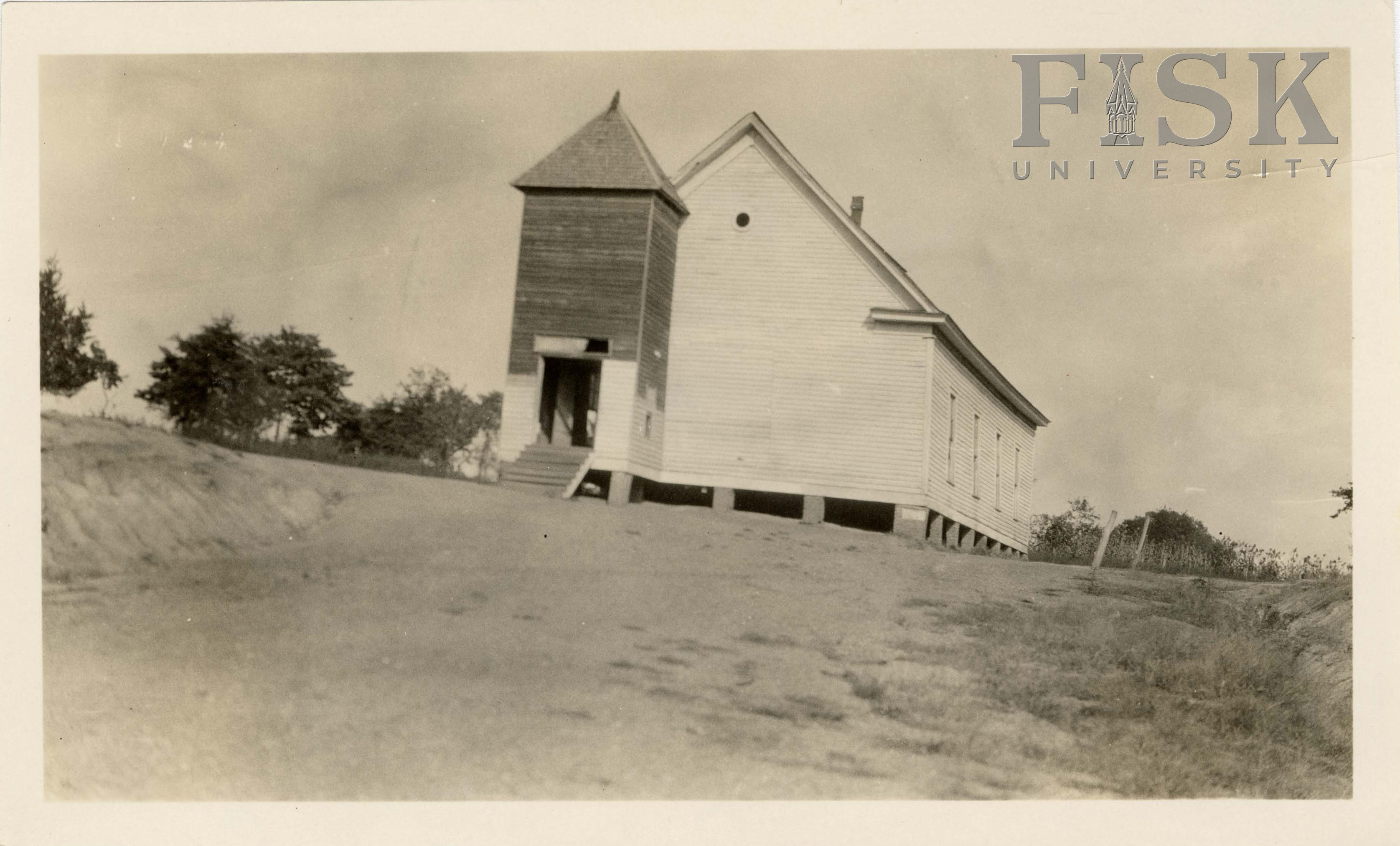 Photo shows the front of Mt. Olive School's old infrastructure with a handwritten note on the back that says "Old Mt. Olive School consolidated with the Farmyard to make the Augusta Rosenwald Consolidated School. Shelby Co. This is an old church and school combined. You will notice that the tower was painted only up to the top of the door or as high as they could reach conveniently."