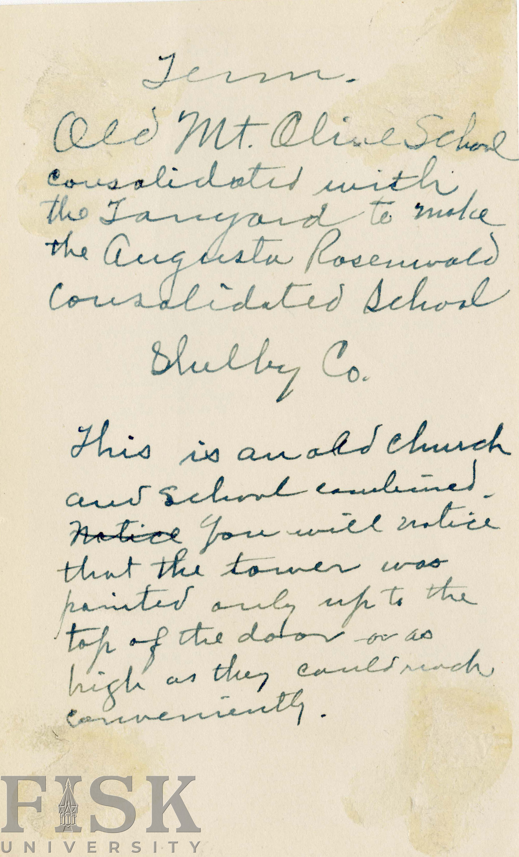- Photo shows the front of Mt. Olive School's old infrastructure with a handwritten note on the back that says "Old Mt. Olive School consolidated with the Farmyard to make the Augusta Rosenwald Consolidated School. Shelby Co. This is an old church and school combined. You will notice that the tower was painted only up to the top of the door or as high as they could reach conveniently."