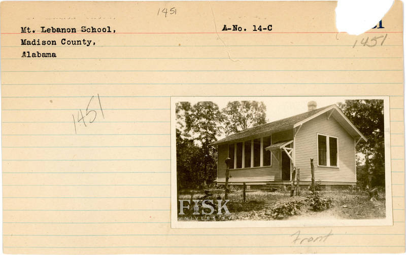 - Photos of Mt. Lebanon School in Madison County, Alabama with a note on the front of the school card that says, "Front" and a note on the back that says, "Rear"