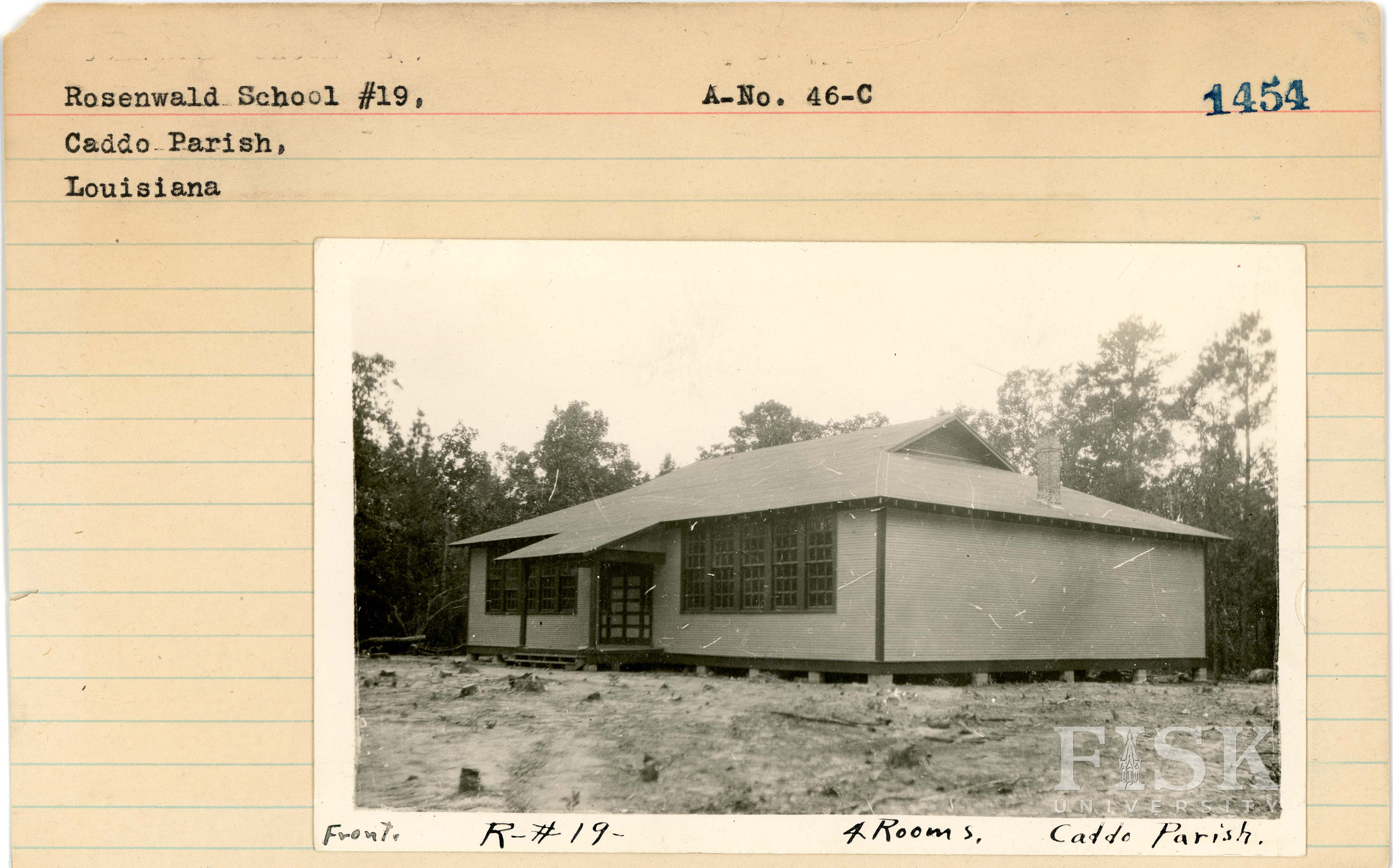 - Photo of Rosenwald School No. 19 in Caddo Parish, Louisiana with an inscription that says, "R-#19, 4 rooms, Caddo Parish"