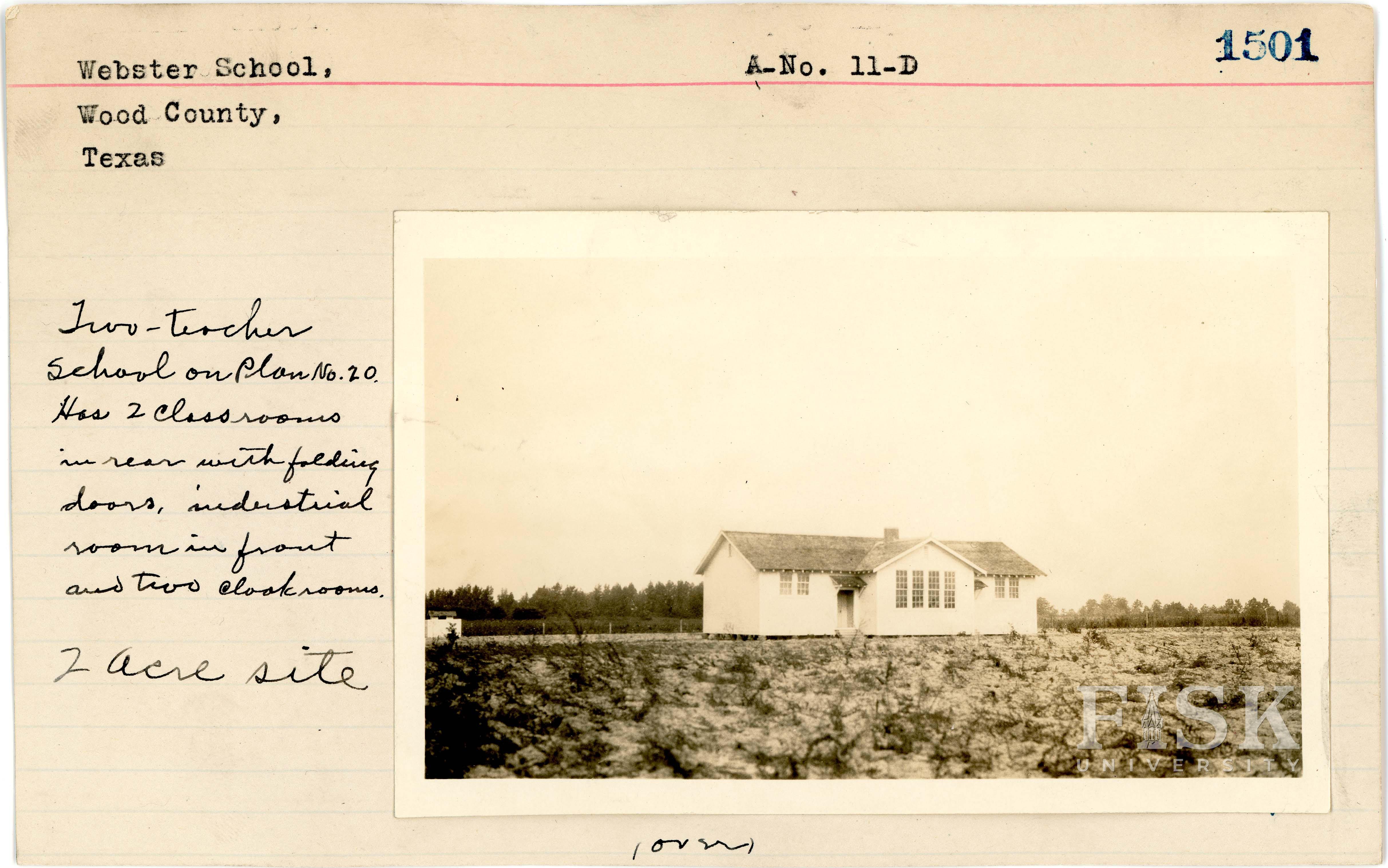 - Photos of Webster School in Wood County, Texas with notes on the front of the school card that say, "Two-teacher school on Plan No. 20. Has 2 classrooms in rear with folding doors, industrial room in front and two cloak rooms" and "2 acre site", and a note on the back that says, "Rear"