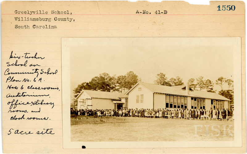 - Photo of students at Greelyville School in Williamsburg County, South Carolina with a note on the school card that says, "Six-teacher school on community school plan no. 6A. Has 6 classrooms, auditorium, office, library rooms, and cloak rooms. 5 acre site"