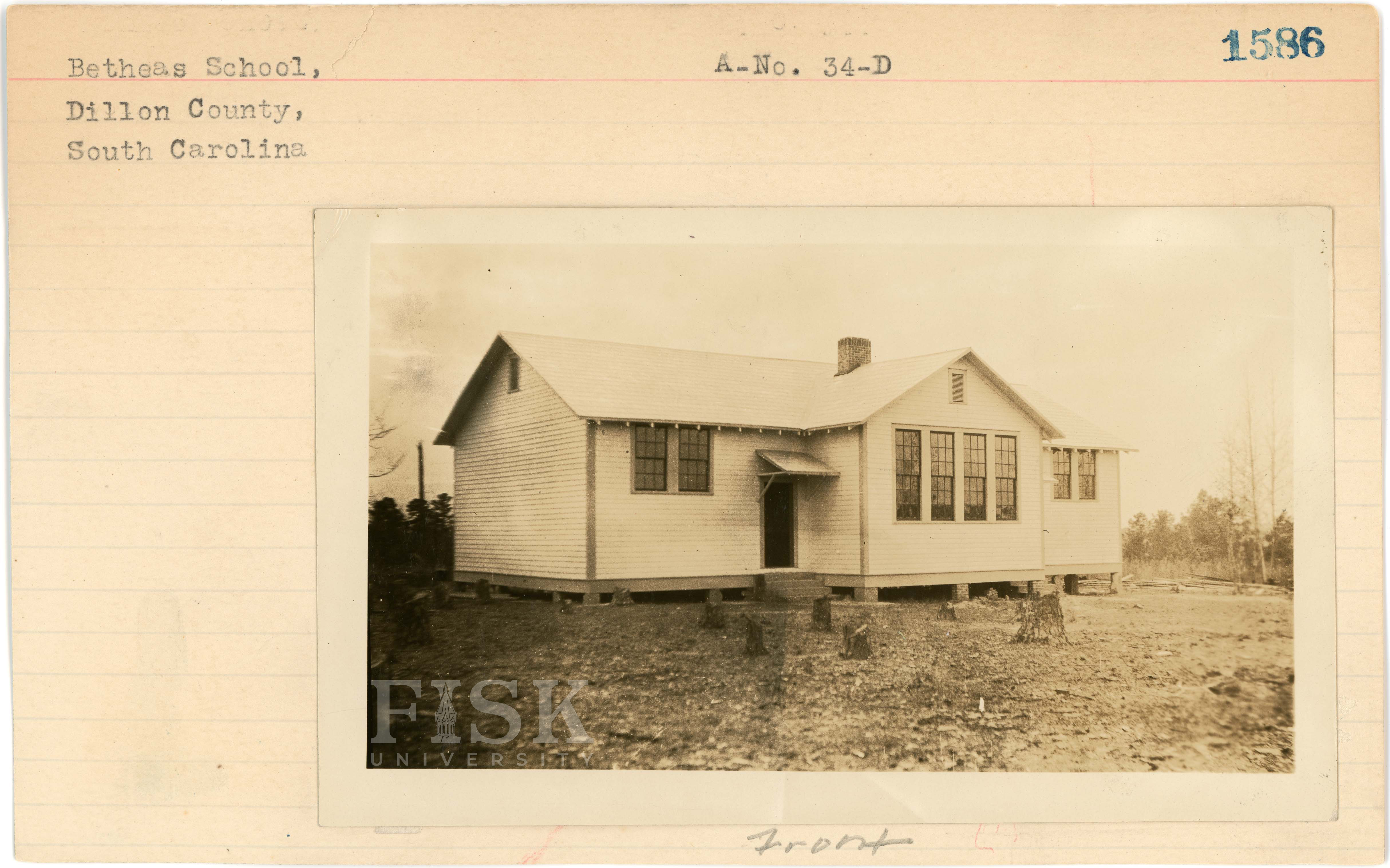 - Photos of Betheas School in Dillon County, South Carolina with a note on the front of the school card that says, "Front" and a note on the back that says, "Rear"
