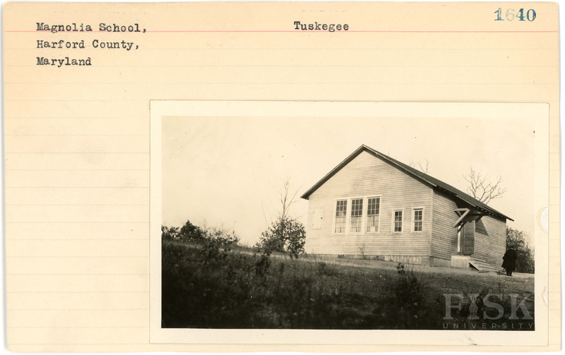 - Photo of Magnolia School in Harford County, Maryland with a note on the school card that says, "Tuskegee"
