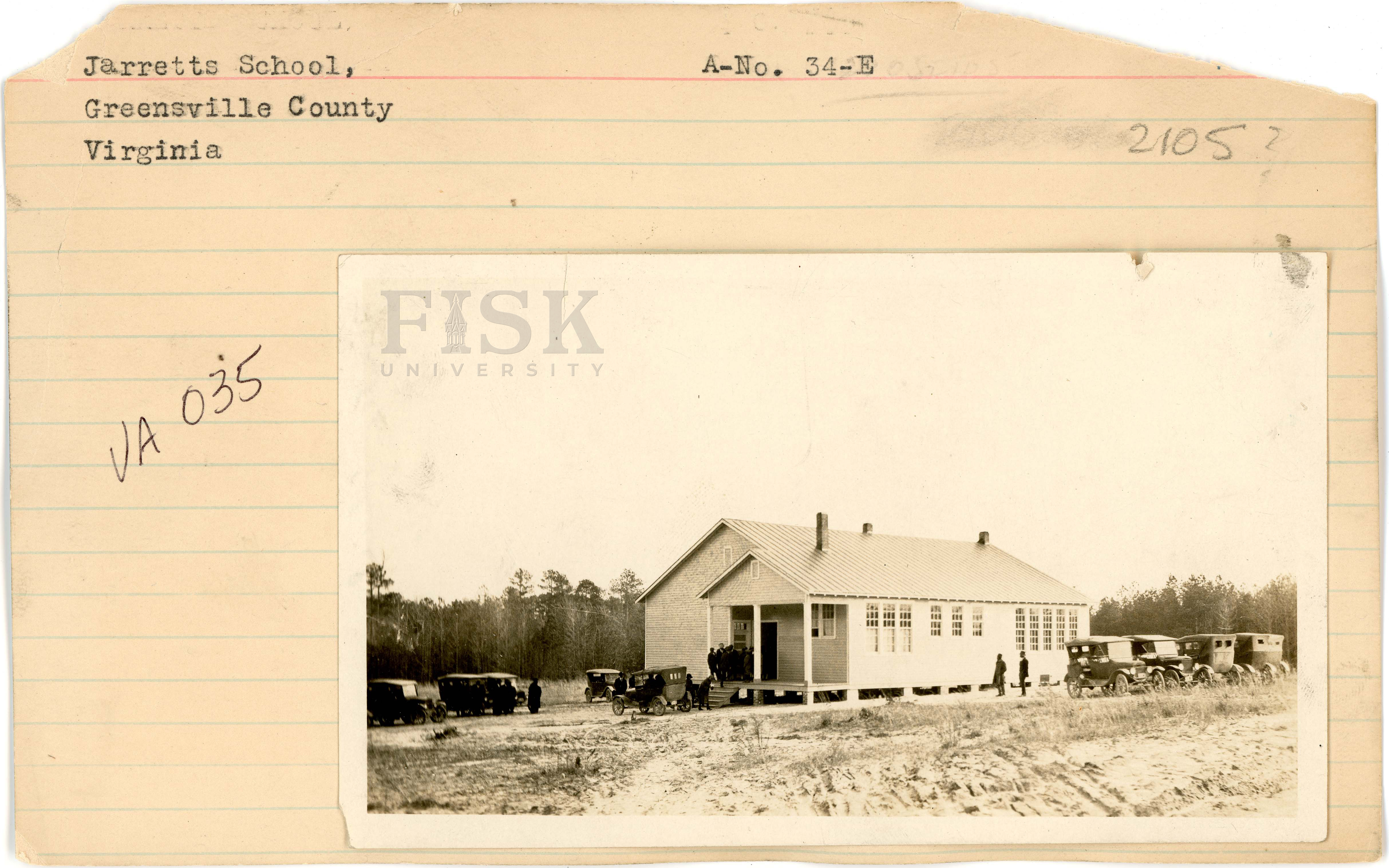 - Photo of Jarretts School in Greensville County, Virginia with a note on the school card that says, "VA 035"